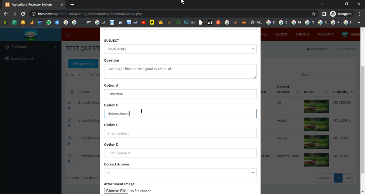 Agriculture students and professionals preparing for certification or competitive exams require a systematic and interactive platform to practice and review subject-specific questions. This project focuses on developing an Agriculture Exam Reviewer in PHP, designed to help users review and test their knowledge in various agricultural topics. The system allows administrators to add questions, categorize them by subject, and manage user accounts, while students can take quizzes, review their answers, and track progress. Using PHP and a MySQL database, the application delivers a secure, user-friendly interface to improve learning outcomes and exam readiness.