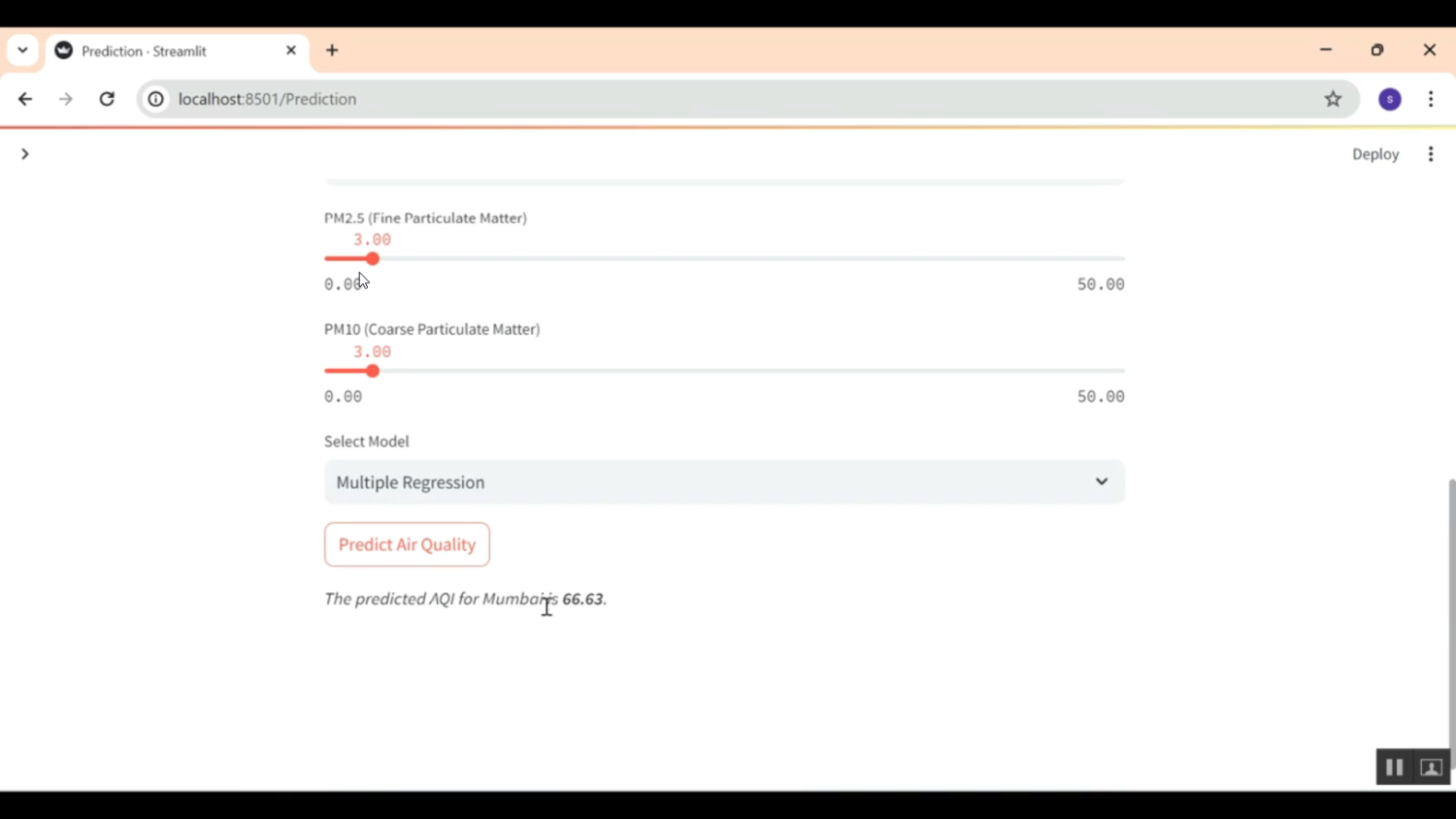 The proposed system introduces a Streamlit-based Air Quality Monitoring and Prediction Application that offers a dynamic, interactive, and intelligent air quality analysis platform. The application preprocesses air quality datasets, calculates pollutant concentrations, and predicts AQI using machine learning algorithms such as Random Forest Regression, Linear Regression, or XGBoost. The Streamlit interface allows users to view pollutant trends through interactive graphs, generate AQI reports, and analyze pollution levels by city or date range. The model also categorizes AQI into standard levels—Good, Moderate, Unhealthy, and Hazardous—according to environmental guidelines and provides precautionary health suggestions. Users can upload CSV datasets or view real-time data visualizations using built-in dashboard components. The system enables easy web deployment, making it accessible for academic use, research, and public awareness. It is fast, flexible, and provides meaningful insights through AI-powered analysis and interactive visual tools.