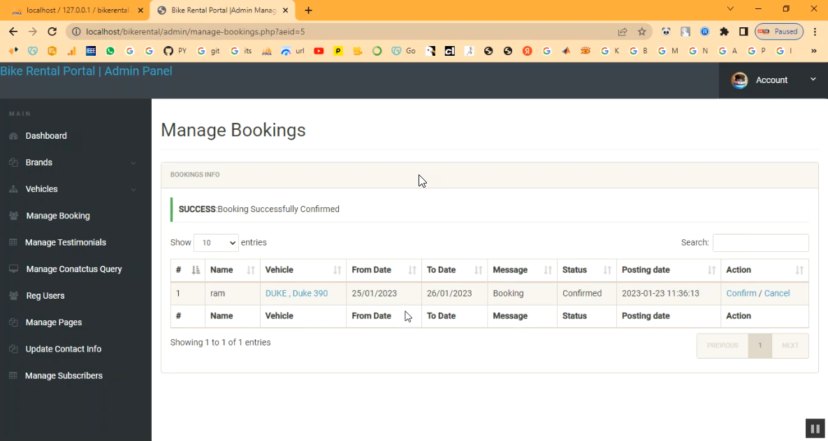 Bike rental services are becoming increasingly popular for urban commuters and tourists who need short-term transportation. This project focuses on developing a Bike Rental Portal System in PHP, designed to automate the process of bike listing, booking, and payment management. The system allows customers to browse available bikes, make reservations online, and track their rental history, while administrators can manage bike inventory, pricing, and bookings. Using PHP with a MySQL database, the application provides secure transactions, real-time availability updates, and a user-friendly interface to improve the bike rental experience.