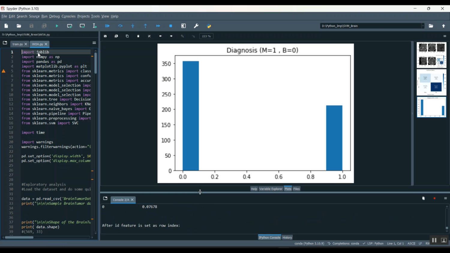 Brain tumor detection is a critical task in medical imaging, as early diagnosis significantly improves treatment outcomes and patient survival rates. Traditional manual methods of analyzing MRI scans are time-consuming and prone to errors due to the complexity of brain structures. This project, Brain SVM WOA Tumor Detection in Python, proposes an intelligent framework that combines Support Vector Machine (SVM) for classification with Whale Optimization Algorithm (WOA) for feature selection and optimization. The system processes MRI brain images, extracts significant features using image processing techniques (such as Gray Level Co-occurrence Matrix (GLCM), texture analysis, and shape features), and applies WOA to select the most relevant features for classification. The optimized features are then classified using an SVM model to determine whether a tumor is present. Implemented in Python using OpenCV, NumPy, Scikit-learn, and optimization libraries, this system ensures higher accuracy, reduced computation time, and robustness compared to traditional methods.