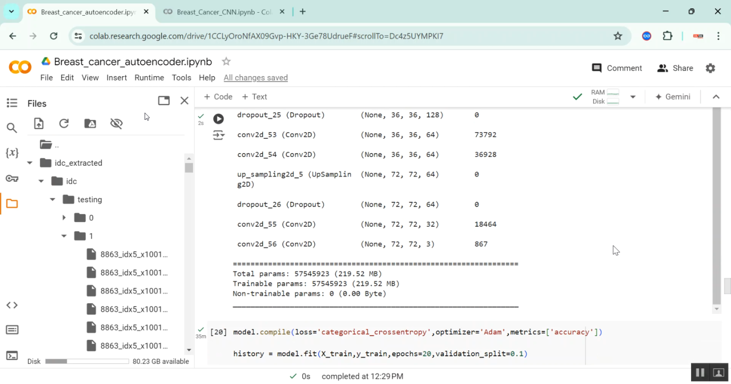 The proposed system introduces a Python-based autoencoder framework for breast cancer classification, implemented on Google Colab for cloud-based computation. Input data (images or structured datasets) are preprocessed using normalization, resizing (for images), and data cleaning. The autoencoder network learns a compressed representation of the input features through an encoder-decoder architecture. The encoded features are then passed to a classifier (dense layers or softmax output) to predict whether the sample is malignant or benign. Model performance is evaluated using metrics like accuracy, precision, recall, F1-score, and ROC-AUC. Visualization tools display reconstructed inputs, latent features, and classification results. Using Colab allows GPU acceleration and interactive notebooks for real-time experimentation. This approach automates feature extraction, enhances classification accuracy, and provides a scalable and efficient solution for breast cancer diagnosis.