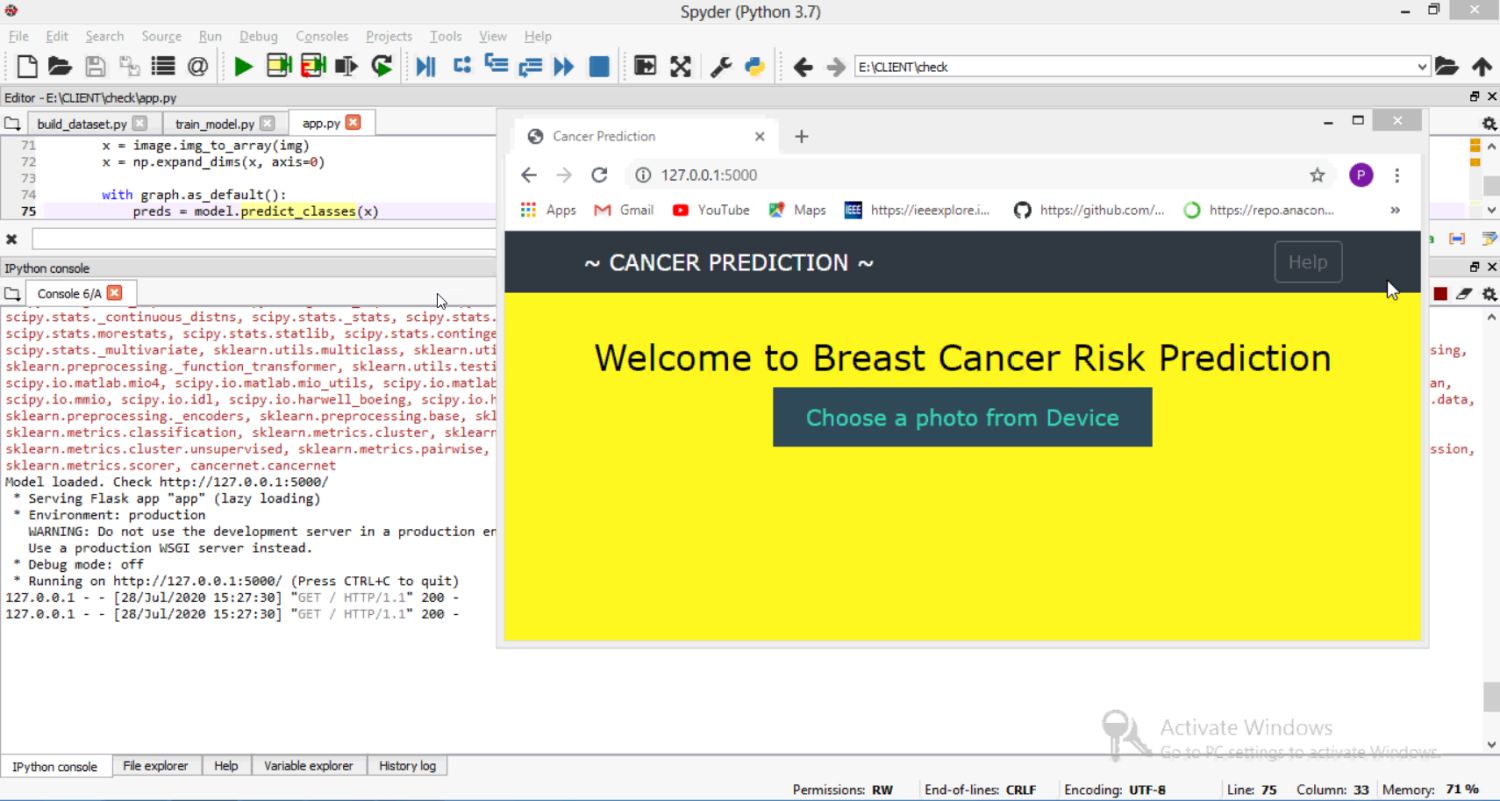 Breast cancer is one of the most common and life-threatening diseases among women worldwide, and its early detection significantly improves survival rates. Traditional diagnostic methods such as mammography and biopsy require expert interpretation and can be time-consuming. This project, Breast Cancer Detection CNN Train Flask App in Python, aims to provide an automated system that detects breast cancer using Convolutional Neural Networks (CNNs) integrated with a Flask web application for real-time accessibility. The CNN model is trained on breast cancer datasets, where image preprocessing, feature extraction, and classification are performed to differentiate between benign and malignant cases. The trained model is deployed using Flask, allowing users to upload medical images and receive prediction results through an interactive web interface. This solution provides a faster, accurate, and user-friendly diagnostic support system for healthcare applications.
