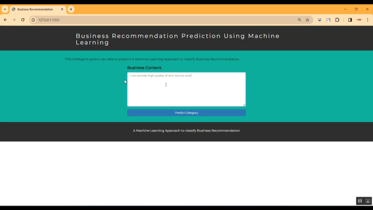 The proposed Business Recommendation Prediction system utilizes Machine Learning-based Recommendation Techniques to deliver personalized business suggestions. The system uses collaborative filtering to learn from user-to-user and item-to-item interactions, while content-based filtering analyzes business similarities based on features such as category, location, ratings, and reviews. A hybrid recommendation model is built to overcome data sparsity issues and improve accuracy. The system uses cosine similarity and KNN for neighborhood-based filtering and Singular Value Decomposition (SVD) for latent factor modeling. The trained model predicts business relevance scores for each user and ranks recommendations accordingly. A user-friendly interface is developed using Streamlit or Flask, where users can enter preferences and receive business recommendations instantly. The system is scalable and can be integrated with real-world platforms.