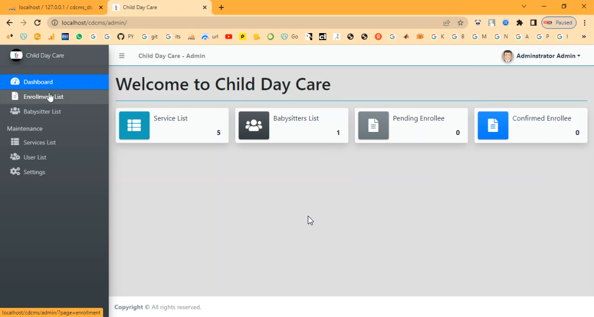 The Child Day Care System in PHP is designed to help childcare centers manage the registration, attendance, and daily activities of children efficiently. This system enables administrators to maintain detailed child profiles, monitor health records, manage staff schedules, and communicate with parents digitally. Built using PHP and MySQL, it provides secure data handling, easy access to records, and a user-friendly interface for day care operators and parents.