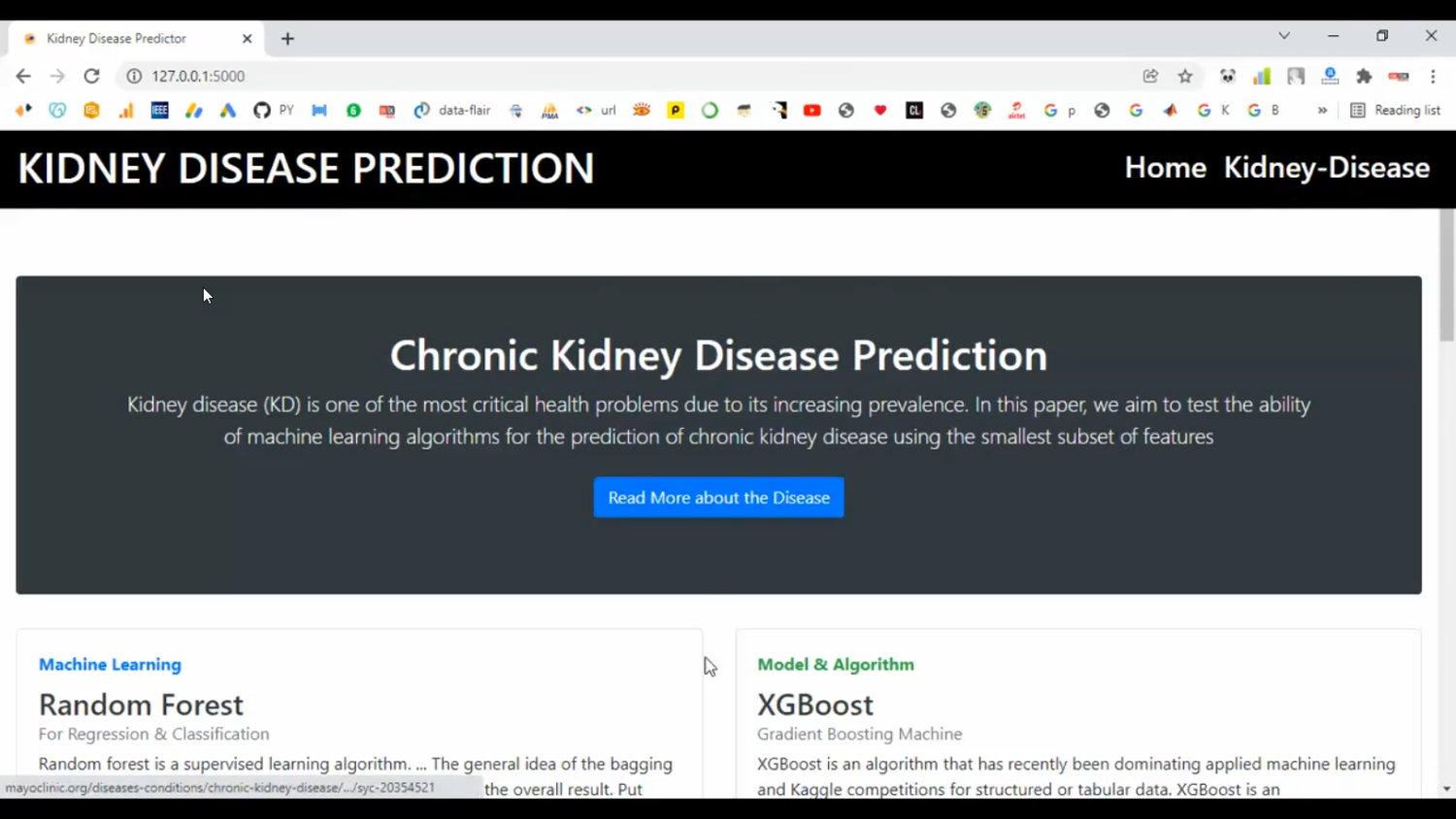 Chronic Kidney Disease (CKD) is a severe health condition that can lead to kidney failure if not diagnosed and managed early. Traditional diagnosis often requires multiple lab tests and expert medical analysis, which can be time-consuming and inaccessible in some areas. This project, Chronic Kidney Data Train Flask App in Python, focuses on developing an automated system that predicts the likelihood of CKD using patient data. The system uses machine learning models such as Random Forest, Support Vector Machine (SVM), or Neural Networks to analyze clinical and demographic features such as blood pressure, glucose levels, blood urea, creatinine, and age. Implemented in Python using Pandas, NumPy, Scikit-learn, and Flask, the trained model is deployed as a web application where users can input patient data and receive real-time predictions, facilitating early diagnosis and intervention.