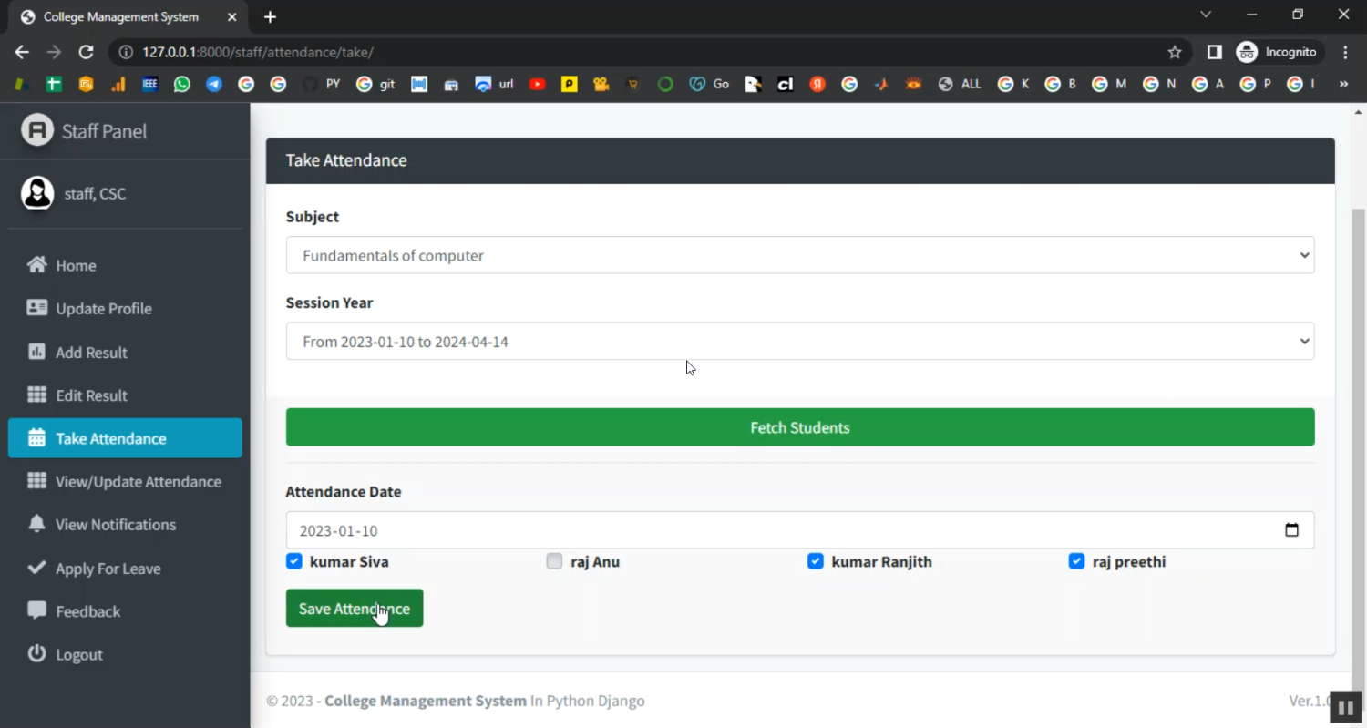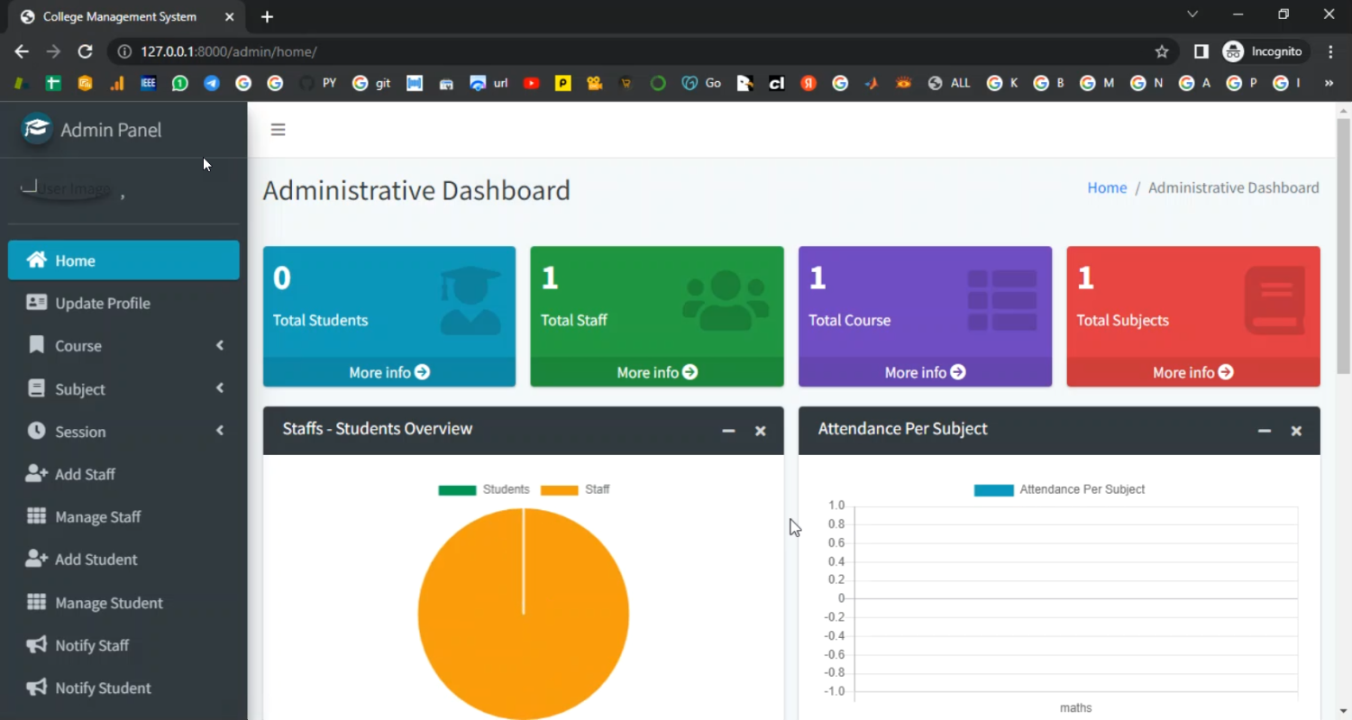A College Management System is an essential tool for modern educational institutions to handle academic and administrative tasks efficiently. Traditional manual systems are prone to delays, errors, and mismanagement of student records, faculty data, and administrative workflows. The College Management System in Django Python provides a secure and scalable web application that allows administrators, faculty, and students to interact through a centralized platform. Core functionalities include student registration, faculty management, course allocation, attendance tracking, timetable scheduling, examination management, result publishing, and fee management. Built with Django, the system ensures role-based access, secure authentication, and real-time data processing, thereby reducing paperwork, improving communication, and streamlining overall college operations.