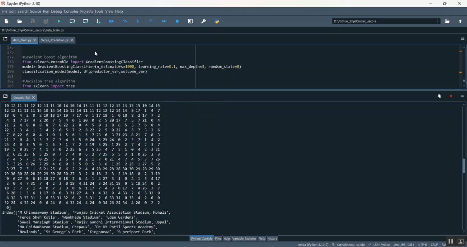 Cricket is one of the most popular sports worldwide, and predicting the first innings score has significant importance for players, analysts, betting markets, and spectators. Estimating the target score involves analyzing factors such as overs played, wickets fallen, run rate, batting lineup, and opposition bowling strength. This project, Cricket First Innings Score Prediction Using Machine Learning in Python, aims to develop a predictive model that estimates the final score of a team in the first innings based on real-time match data. Using Python libraries such as Pandas, NumPy, Scikit-learn, and Matplotlib, the dataset is preprocessed, key features are extracted, and machine learning models such as Linear Regression, Random Forest, or Gradient Boosting are applied to predict the score. The system helps in strategic planning and provides real-time insights during live matches.