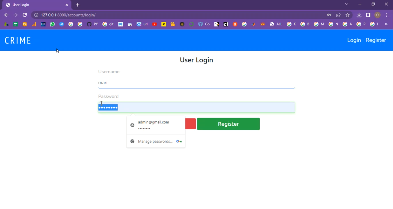 The proposed Django-based Crime Information System addresses these issues by providing a centralized and digital platform for crime reporting and management. Citizens can register complaints online, upload evidence (images, documents), and track the status of their cases. Administrators and police officers can manage records of criminals, categorize crimes (theft, assault, cybercrime, etc.), and update case progress. The system includes real-time notifications, secure login, role-based dashboards, and advanced search/filter options. Additionally, crime data can be analyzed to identify patterns, generate statistical reports, and predict high-crime zones. Compared to the existing system, this solution ensures efficiency, accuracy, transparency, and scalability, while fostering better collaboration between citizens and law enforcement.