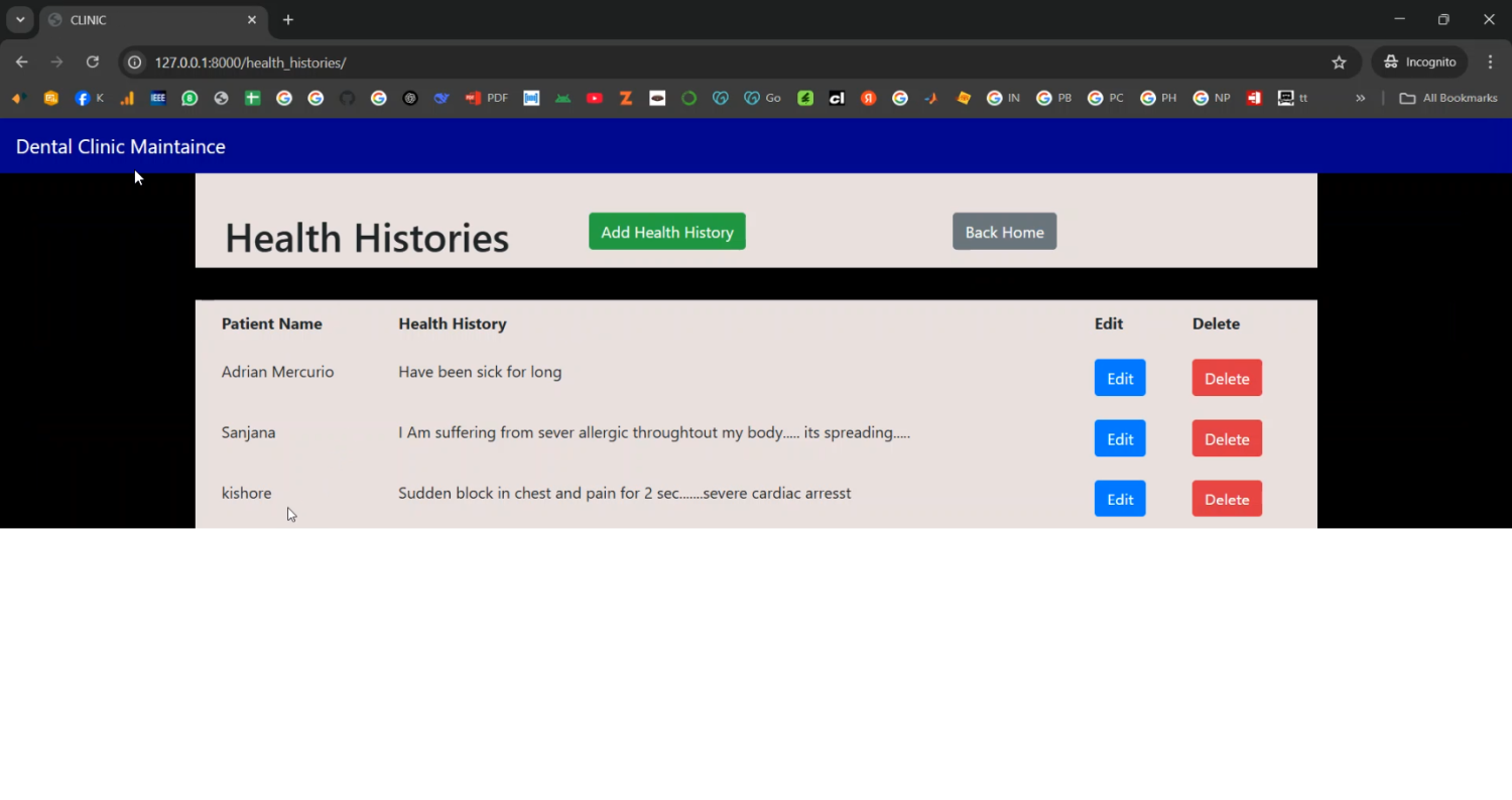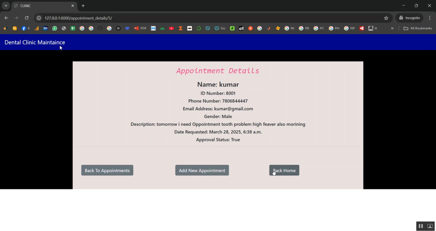 Efficient management of dental clinics requires organized patient records, treatment histories, and accurate tracking of dental conditions. This project focuses on developing a Dental Clinic Maintenance and Tooth Chart Generation system using Django Python, designed to streamline clinic operations while providing a visual representation of patients’ dental health. The system allows dentists to maintain patient profiles, record treatments, schedule appointments, and generate dynamic tooth charts for diagnostic and treatment purposes. By digitizing clinic management and automating tooth chart generation, the system enhances workflow efficiency, accuracy in patient care, and long-term record maintenance.