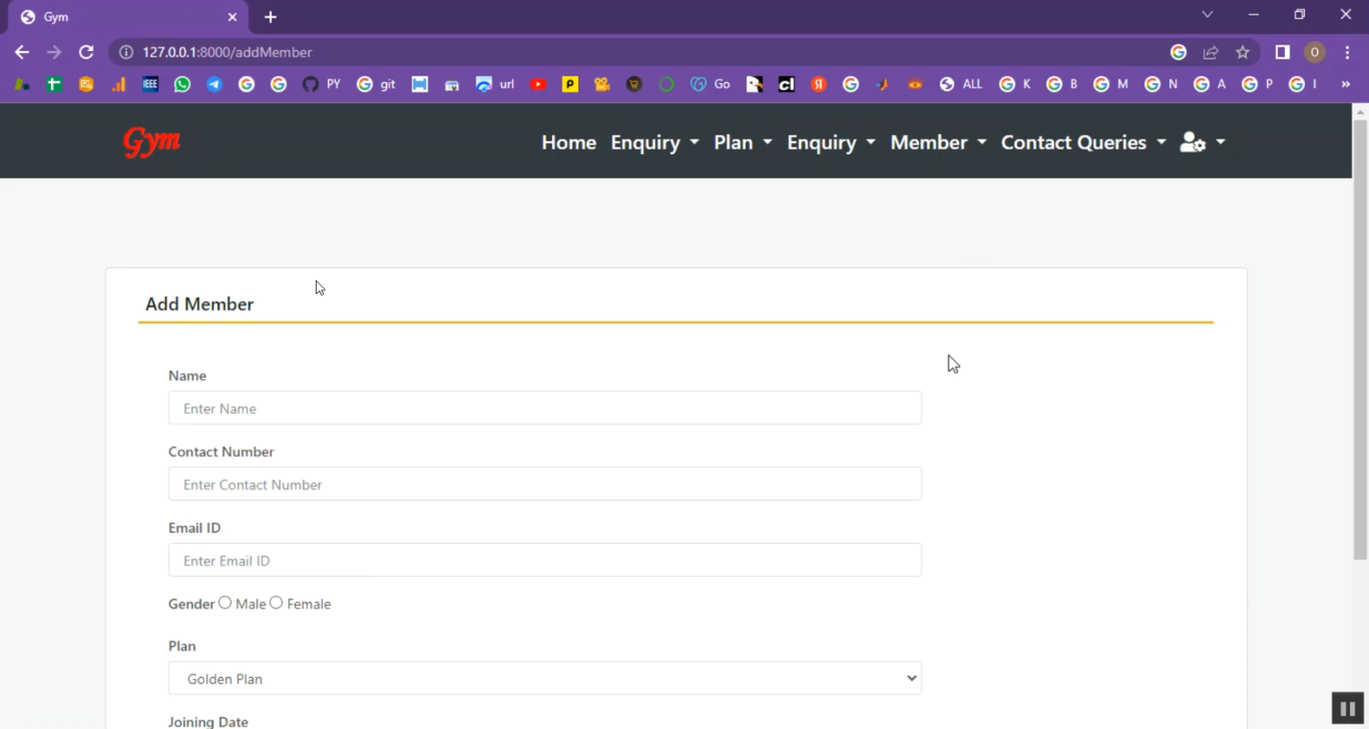 Managing a gym involves handling memberships, trainers, workout schedules, and payments, which can become complex without a centralized system. This project focuses on developing a Gym Management System in Django Python, designed to automate and streamline gym operations. The system allows gym owners or administrators to register members, assign trainers, manage workout and diet plans, track attendance, and process payments. By leveraging Django’s secure and scalable framework, the application improves efficiency, reduces paperwork, and provides real-time insights into gym operations, ensuring a smooth experience for both members and management.