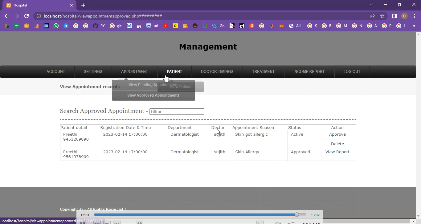 The proposed Hospital Treatment Appointment Management System automates and centralizes the appointment process using PHP and MySQL. Patients can register and log in to view doctors, treatment categories, available time slots, and book appointments online. Doctors and administrators can manage their schedules, approve or reschedule appointments, and keep track of patient treatment history. The system can send automated notifications or emails for appointment confirmations and reminders. It also generates reports of booked, pending, and completed appointments for hospital management. By providing a secure, centralized, and user-friendly interface, the system enhances efficiency, reduces errors, and improves the overall treatment and appointment experience for both patients and hospital staff.