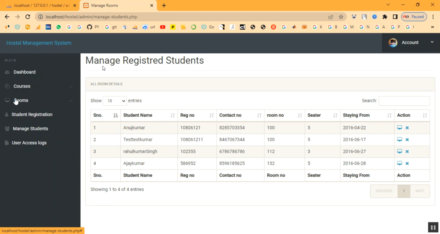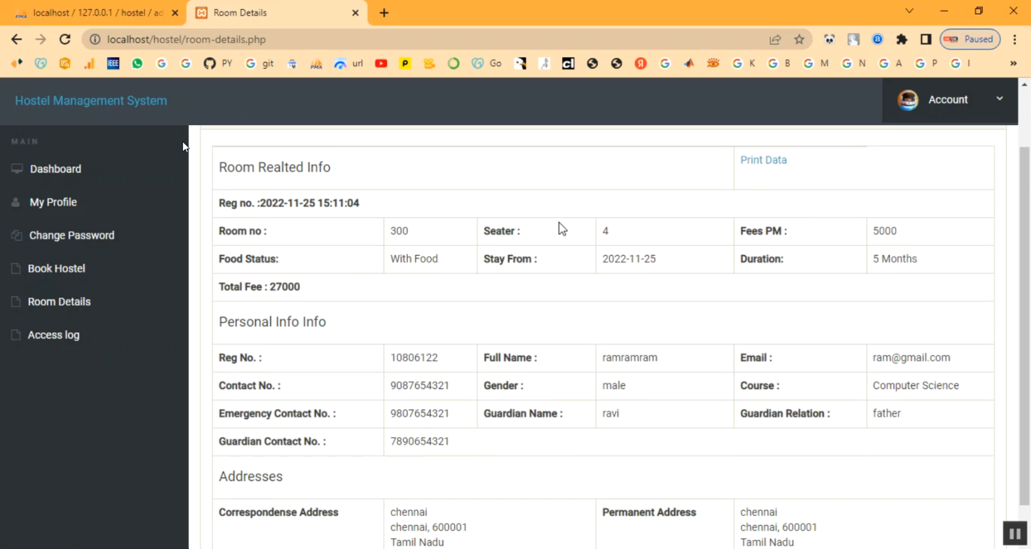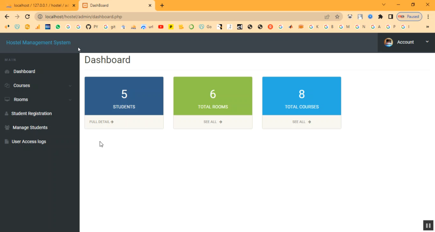 The Hostel Management System is a PHP–MySQL based web application designed to automate and streamline hostel operations. This system manages student registrations, room allocations, fee payments, staff records, maintenance requests, and visitor logs from a centralized platform. By digitizing hostel administration, it reduces paperwork, ensures accurate record-keeping, and improves communication between hostel staff and residents. The system also generates detailed reports, making it easier for administrators to monitor occupancy, fees, and maintenance activities.