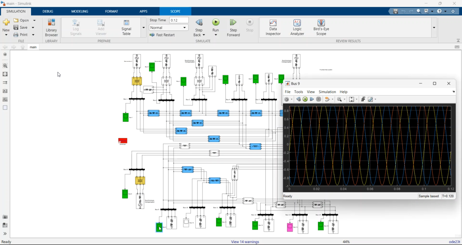 The proposed system develops a full graphical Simulink model of the IEEE 14-Bus System using MATLAB’s Simscape Electrical Specialized Power Systems library. This model includes: