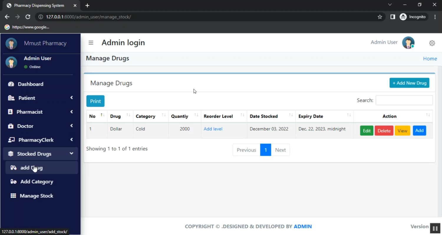 The proposed Pharmacy Management System in Django Python provides a centralized platform where pharmacists can record prescriptions, manage medicine inventory, track stock levels, and generate automated sales and expiry reports. Customers’ prescription history and medicine details are stored securely for easy reference. The system also includes alerts for low stock or near-expiry medicines, search functionality for quick access, and dashboards for performance monitoring. By integrating inventory, sales, and prescription management, the system improves pharmacists’ efficiency, reduces operational errors, and ensures timely and accurate service delivery to customers.