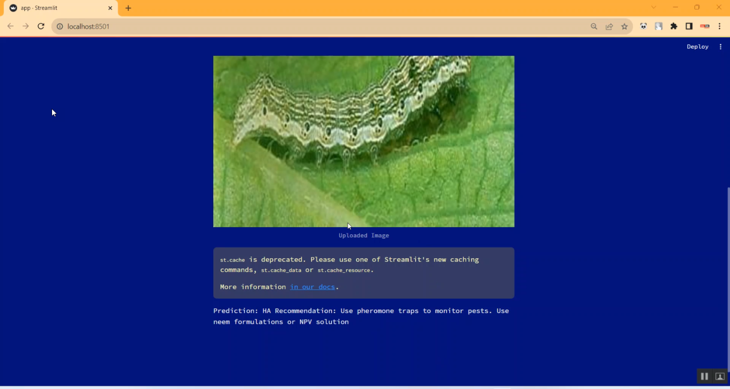 The proposed system implements a CNN-based pest detection framework that can automatically identify and classify pests from uploaded plant images. The system preprocesses the images through resizing, normalization, and data augmentation to improve model robustness. The CNN model is trained on a labeled dataset of pest images to learn distinctive features and accurately classify different pest species. The Streamlit web application enables users to interactively upload images and receive immediate results, including pest type, probability scores, and recommended management actions. Python libraries such as OpenCV handle image preprocessing, TensorFlow/Keras manage model training and inference, and NumPy/Pandas support data manipulation. This approach ensures fast, reliable, and user-friendly pest detection suitable for precision agriculture and farm management.