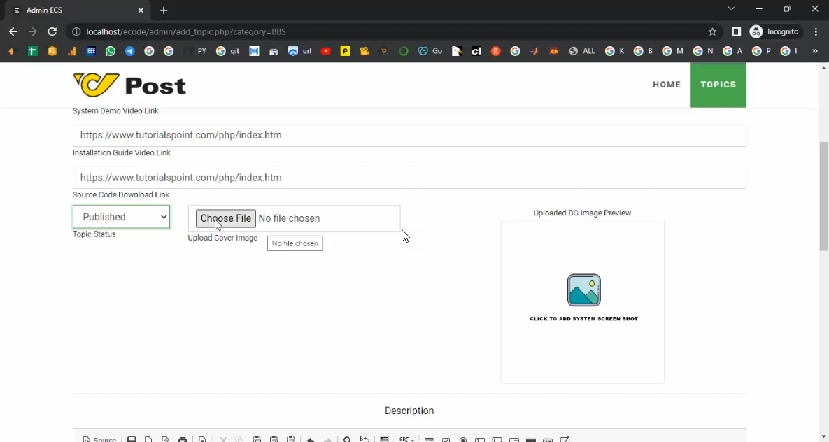 The Post Blog System is a PHP–MySQL based web application that enables users to create, publish, and manage blog posts online. This system allows administrators to moderate content, manage users, and organize posts by categories or tags. Registered users can write blog posts, upload images, comment, and interact with other users. By automating blog publishing, the system creates a user-friendly platform for sharing knowledge, opinions, and news in a structured and easily accessible way.