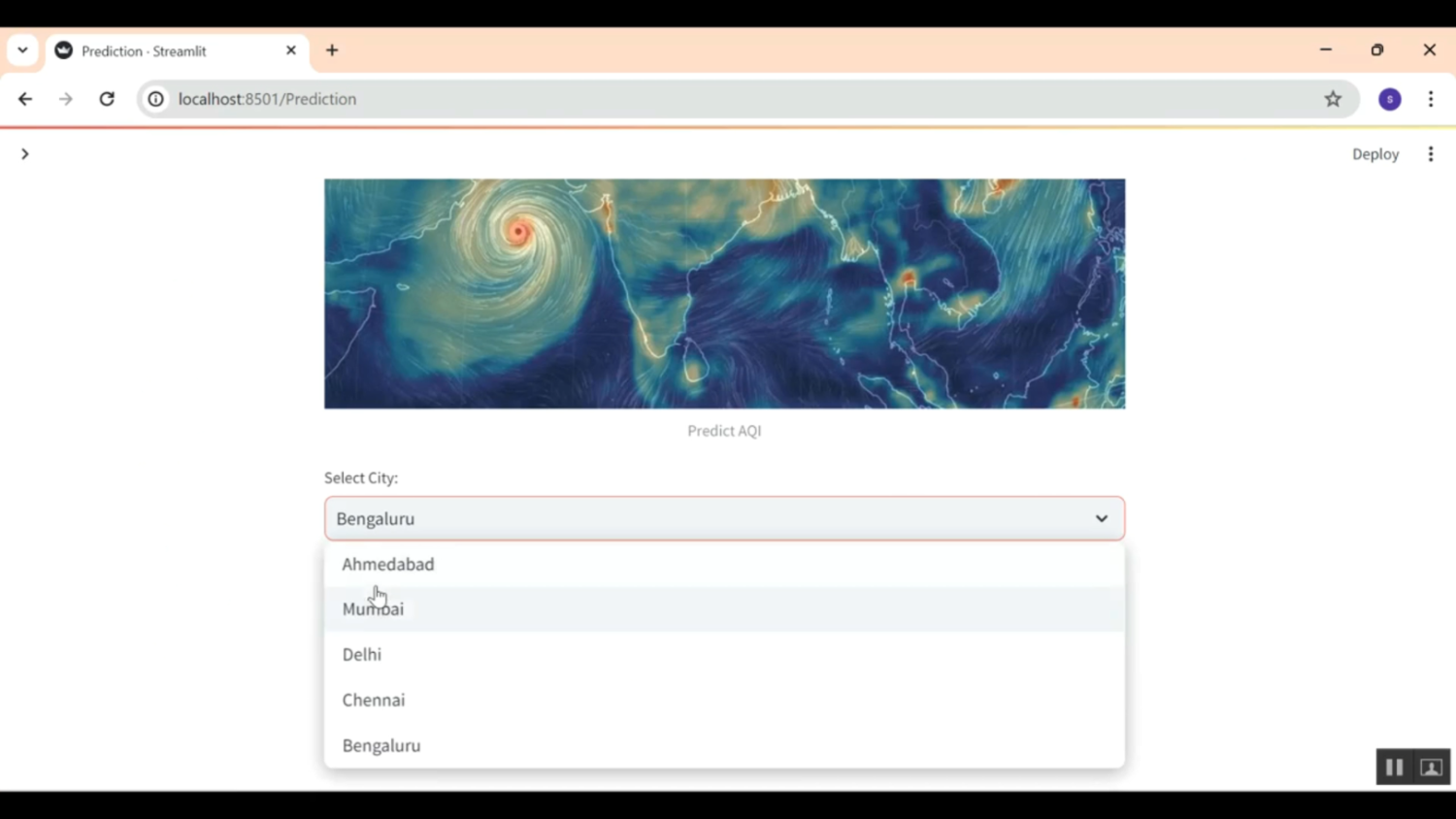 Air pollution is a major environmental issue that affects public health, climate conditions, and ecosystem balance. The Air Quality Streamlit Application in Python aims to provide a real-time and interactive platform for monitoring and analyzing air quality parameters. The application utilizes datasets containing pollutant concentrations such as PM2.5, PM10, NO₂, CO, SO₂, and O₃ to calculate and visualize the Air Quality Index (AQI). Python libraries like Pandas, NumPy, Scikit-learn, and Plotly are used for data processing, machine learning-based AQI prediction, and visualization, while Streamlit is employed to build a user-friendly web interface. Users can upload datasets or fetch real-time data from online sources to monitor pollution levels. The system predicts future AQI values and provides health recommendations based on air quality categories. This application promotes environmental awareness and supports decision-making in smart city development and environmental management.