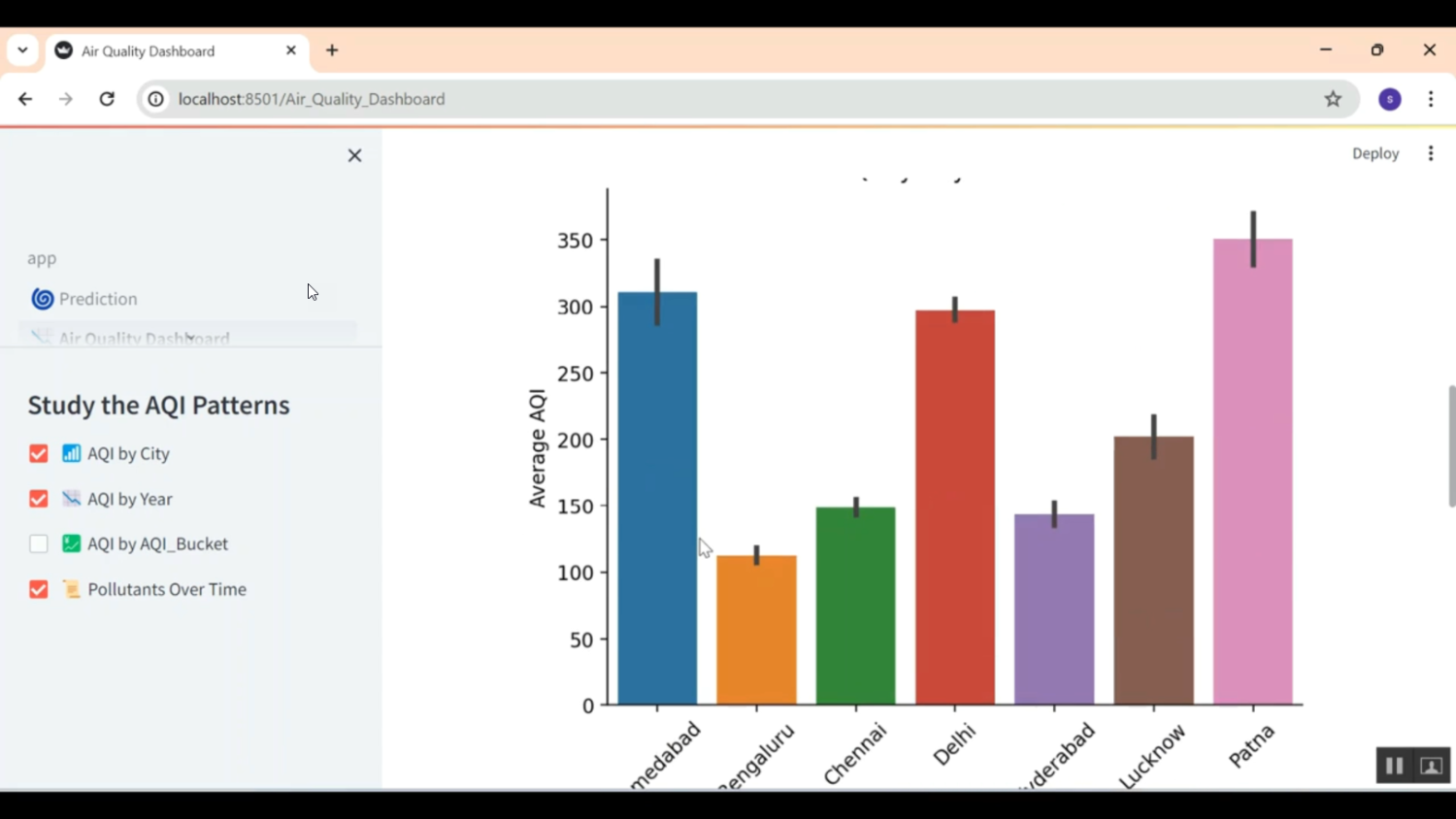 The proposed system introduces a Streamlit-based Air Quality Monitoring and Prediction Application that offers a dynamic, interactive, and intelligent air quality analysis platform. The application preprocesses air quality datasets, calculates pollutant concentrations, and predicts AQI using machine learning algorithms such as Random Forest Regression, Linear Regression, or XGBoost. The Streamlit interface allows users to view pollutant trends through interactive graphs, generate AQI reports, and analyze pollution levels by city or date range. The model also categorizes AQI into standard levels—Good, Moderate, Unhealthy, and Hazardous—according to environmental guidelines and provides precautionary health suggestions. Users can upload CSV datasets or view real-time data visualizations using built-in dashboard components. The system enables easy web deployment, making it accessible for academic use, research, and public awareness. It is fast, flexible, and provides meaningful insights through AI-powered analysis and interactive visual tools.