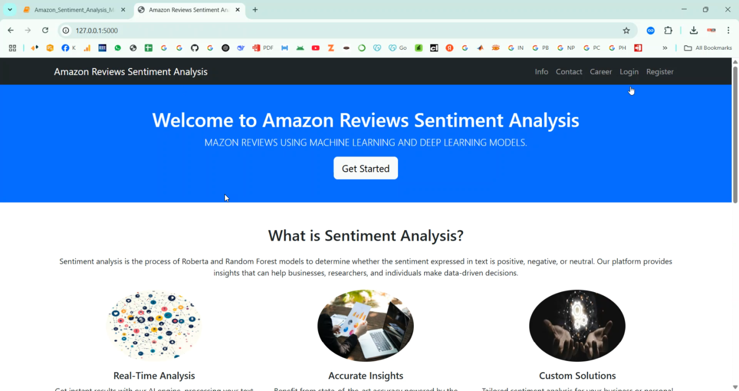 The proposed system introduces a machine learning and deep learning-based sentiment analysis model to automatically classify Amazon customer reviews with high accuracy. The system uses text preprocessing techniques such as tokenization, stemming, stop-word removal, and lemmatization to clean raw review data. Feature extraction methods like TF-IDF, Bag of Words, or word embeddings (Word2Vec, GloVe, BERT) are used to convert text into numerical form for model training. Supervised learning algorithms such as Logistic Regression, Naïve Bayes, Random Forest, and Support Vector Machine are used for sentiment classification, while advanced models like LSTM, Bi-LSTM, and BERT improve contextual understanding and sentiment prediction accuracy. The system also identifies sentiment polarity, subjectivity, and aspect-based sentiments for detailed analysis. Finally, data visualization libraries like Matplotlib and Seaborn are used to display sentiment trends and insights. This automated sentiment analysis provides intelligent review insights, helps detect fake or biased reviews, and supports decision-making for both businesses and consumers.