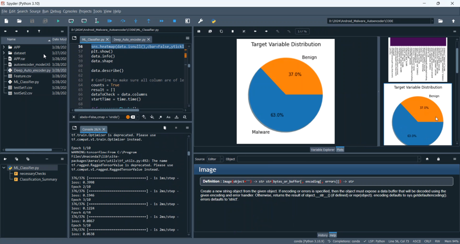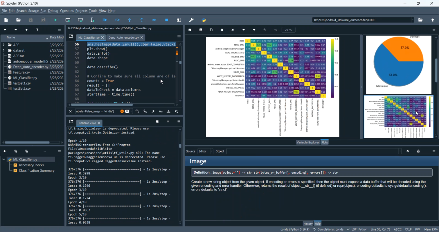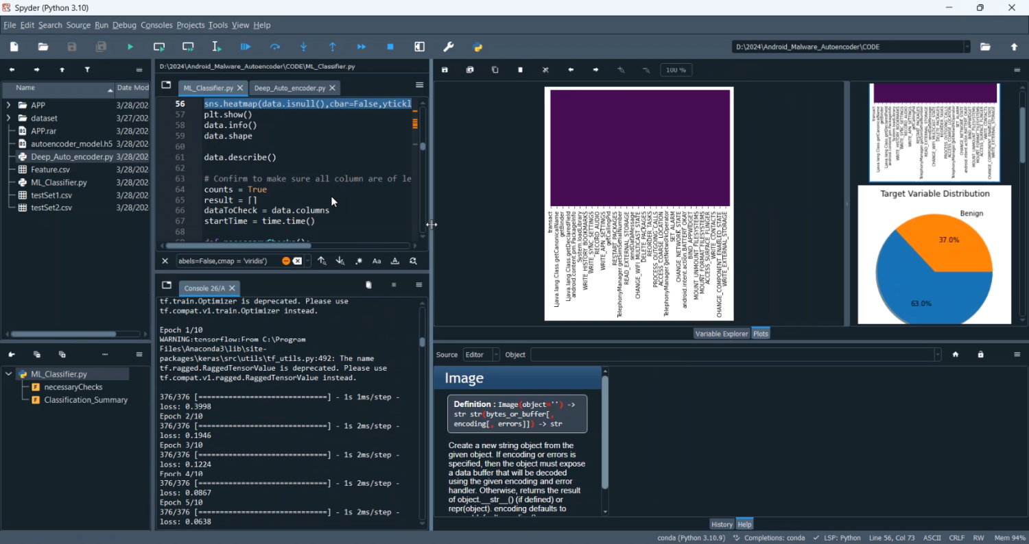 The proposed system introduces a deep learning-based autoencoder model for Android malware detection. APK files are first analyzed to extract static features such as requested permissions, API calls, and manifest properties. These features are converted into numerical representations suitable for neural networks. The autoencoder is trained on benign application features to learn the normal distribution of apps. When a new application is tested, its features are passed through the autoencoder; high reconstruction error indicates deviation from normal behavior, flagging potential malware. The model is developed using Python with TensorFlow/Keras, and Pandas/NumPy is used for preprocessing and handling datasets. A user interface can be created using Flask or Streamlit to upload APK feature summaries, compute anomaly scores, and visualize results. This system ensures automated, accurate, and scalable detection of Android malware and reduces dependency on signature databases while providing insights into anomalous behavior patterns.