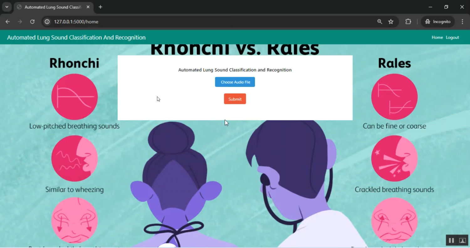 The proposed system introduces a Python-based automated lung sound classification framework that combines advanced signal processing and machine learning techniques. Recorded lung sounds are preprocessed to remove noise and segment breathing cycles. Features such as MFCCs, spectral roll-off, zero-crossing rate, and wavelet coefficients are extracted to represent the audio signals effectively. These features are fed into machine learning models like CNNs or hybrid models (CNN + LSTM) to classify lung sounds into multiple categories: normal, wheeze, crackle, or other abnormal patterns. The system is implemented using Python libraries including Librosa for audio processing, TensorFlow/Keras for deep learning, and Scikit-learn for classical machine learning models. A simple user interface can be developed using Streamlit or Tkinter, allowing healthcare providers to upload audio files, view real-time classification results, and visualize relevant features. This approach enhances diagnostic accuracy, reduces dependence on expert clinicians, and provides a scalable, non-invasive tool for monitoring respiratory health.