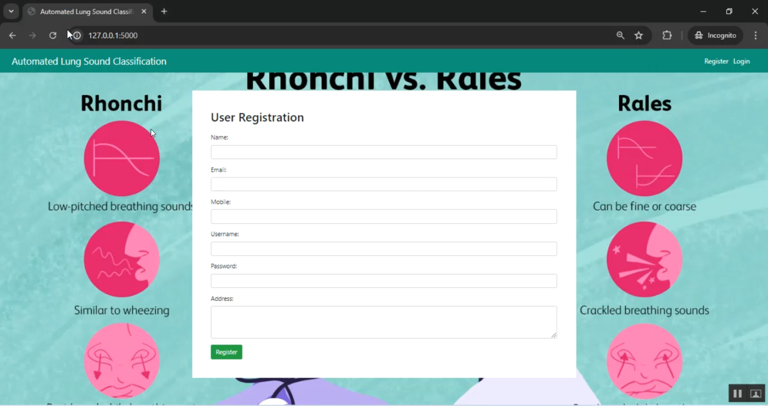 In the existing system, lung sound analysis is primarily performed manually by clinicians using stethoscopes, which is highly dependent on the experience and skill of the healthcare professional. Traditional computer-aided methods rely on simple statistical analysis or handcrafted features for classification, which may not capture the complex patterns in lung sounds. Many existing automated systems are limited to binary classification (normal vs abnormal) and cannot accurately distinguish among multiple types of respiratory disorders. Additionally, most systems lack scalability, real-time processing, and integration with user-friendly interfaces, making them less practical for large-scale clinical deployment.