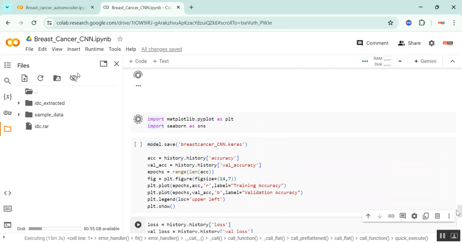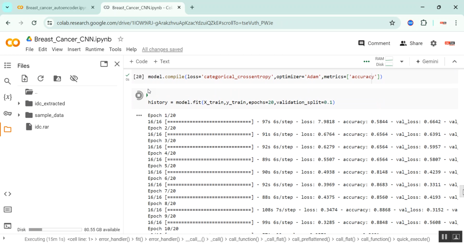 The proposed system introduces a Python-based autoencoder framework for breast cancer classification, implemented on Google Colab for cloud-based computation. Input data (images or structured datasets) are preprocessed using normalization, resizing (for images), and data cleaning. The autoencoder network learns a compressed representation of the input features through an encoder-decoder architecture. The encoded features are then passed to a classifier (dense layers or softmax output) to predict whether the sample is malignant or benign. Model performance is evaluated using metrics like accuracy, precision, recall, F1-score, and ROC-AUC. Visualization tools display reconstructed inputs, latent features, and classification results. Using Colab allows GPU acceleration and interactive notebooks for real-time experimentation. This approach automates feature extraction, enhances classification accuracy, and provides a scalable and efficient solution for breast cancer diagnosis.