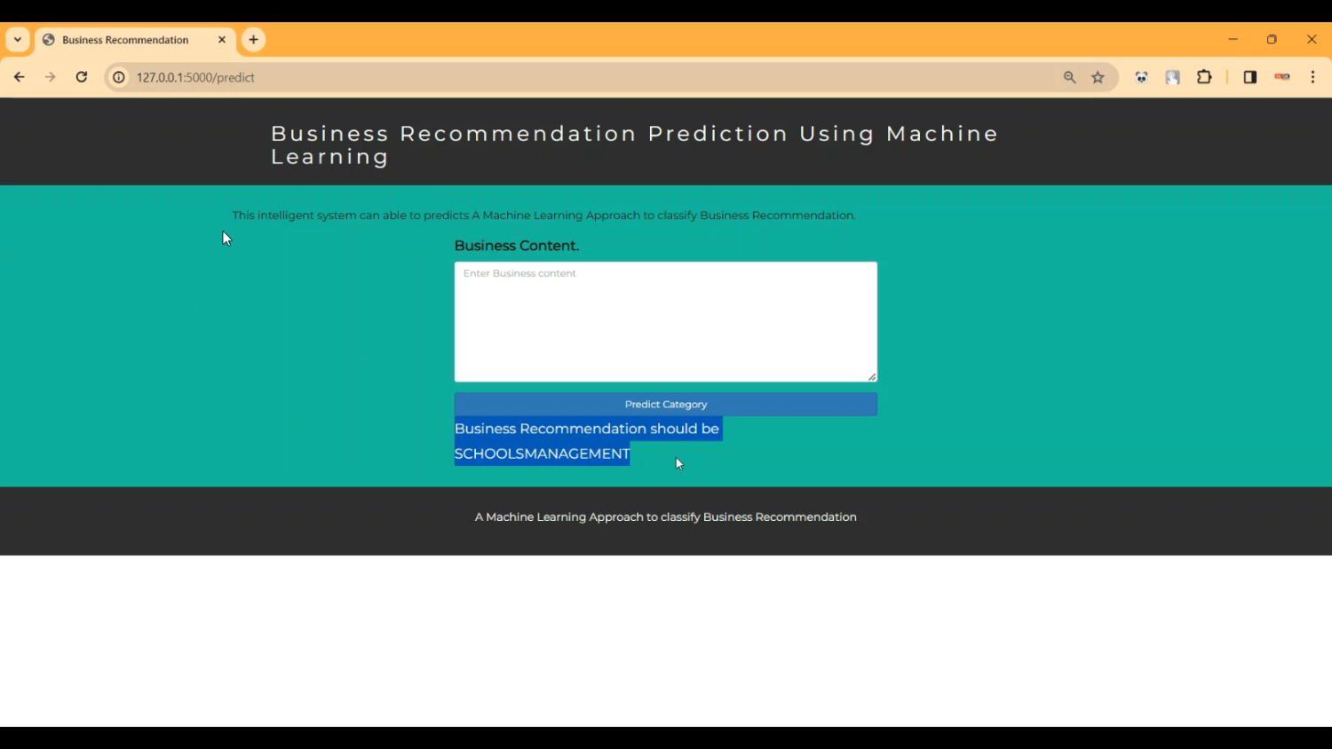 In the rapidly growing digital market, personalized business recommendations have become essential for enhancing customer experience and improving decision-making. This project presents a Business Recommendation Prediction System using Machine Learning implemented in Python. The system analyzes user preferences, historical business data, and feedback to generate relevant recommendations that align with user interests. The model integrates collaborative filtering and content-based filtering, supported by machine learning algorithms like KNN, Random Forest, and Matrix Factorization. Python libraries such as Pandas, Scikit-learn, NumPy, and Flask are used to build and deploy the recommendation system. The proposed system offers intelligent, data-driven suggestions that can be used in applications like e-commerce, service booking, and business listing platforms (e.g., Yelp or Justdial), helping users discover the most suitable businesses efficiently.