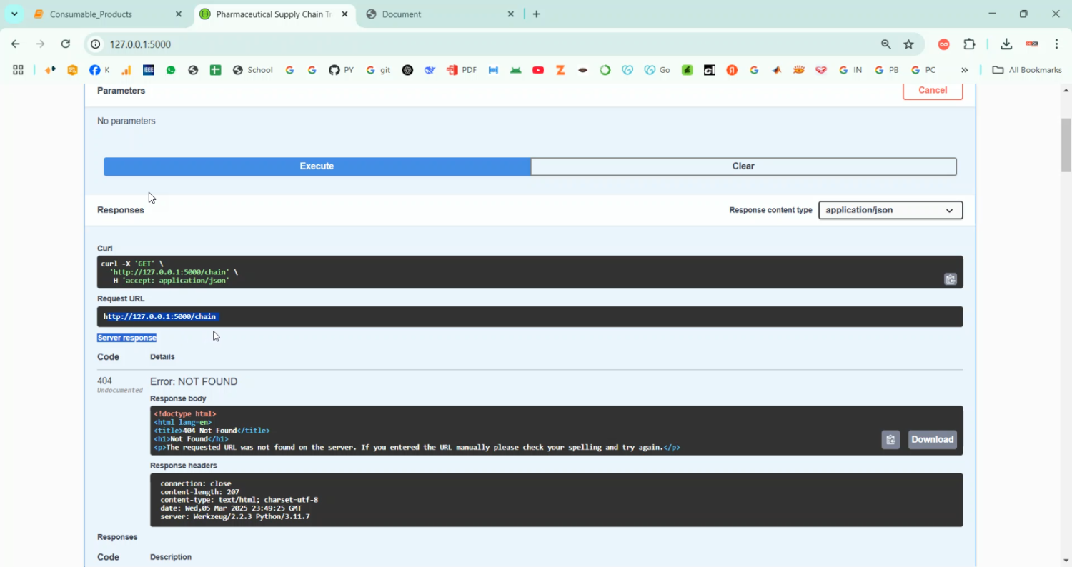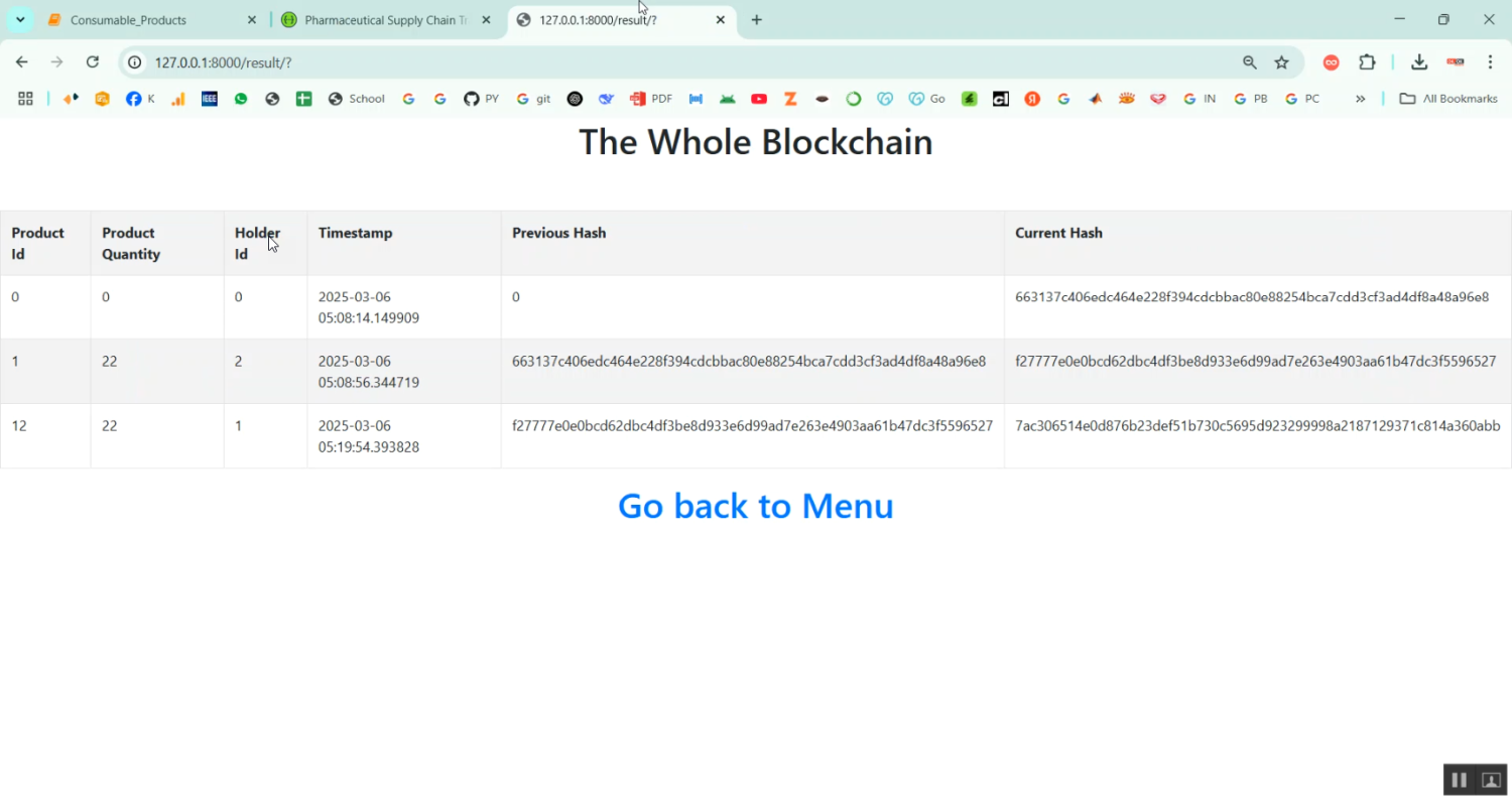 The proposed system introduces a blockchain-based solution using Python for secure and transparent supply chain management of consumable products. Each transaction, such as product creation, shipment, storage, and delivery, is recorded as a block in the blockchain. The block contains a timestamp, product ID, current location, ownership details, and a cryptographic hash to ensure integrity. A peer-to-peer network allows all stakeholders to access a synchronized version of the blockchain, ensuring transparency. Smart contract integration can automate validation processes for shipments and payments. Python libraries such as Flask are used to develop REST APIs, allowing users to interact with the blockchain through a user interface. Hashing is implemented using Python’s hashlib, and consensus is maintained to validate new blocks. The system supports real-time tracking, product verification via QR code scan, and secure audit trails. It minimizes fraud, prevents counterfeit product circulation, and enhances customer trust by ensuring product authenticity across the supply chain.