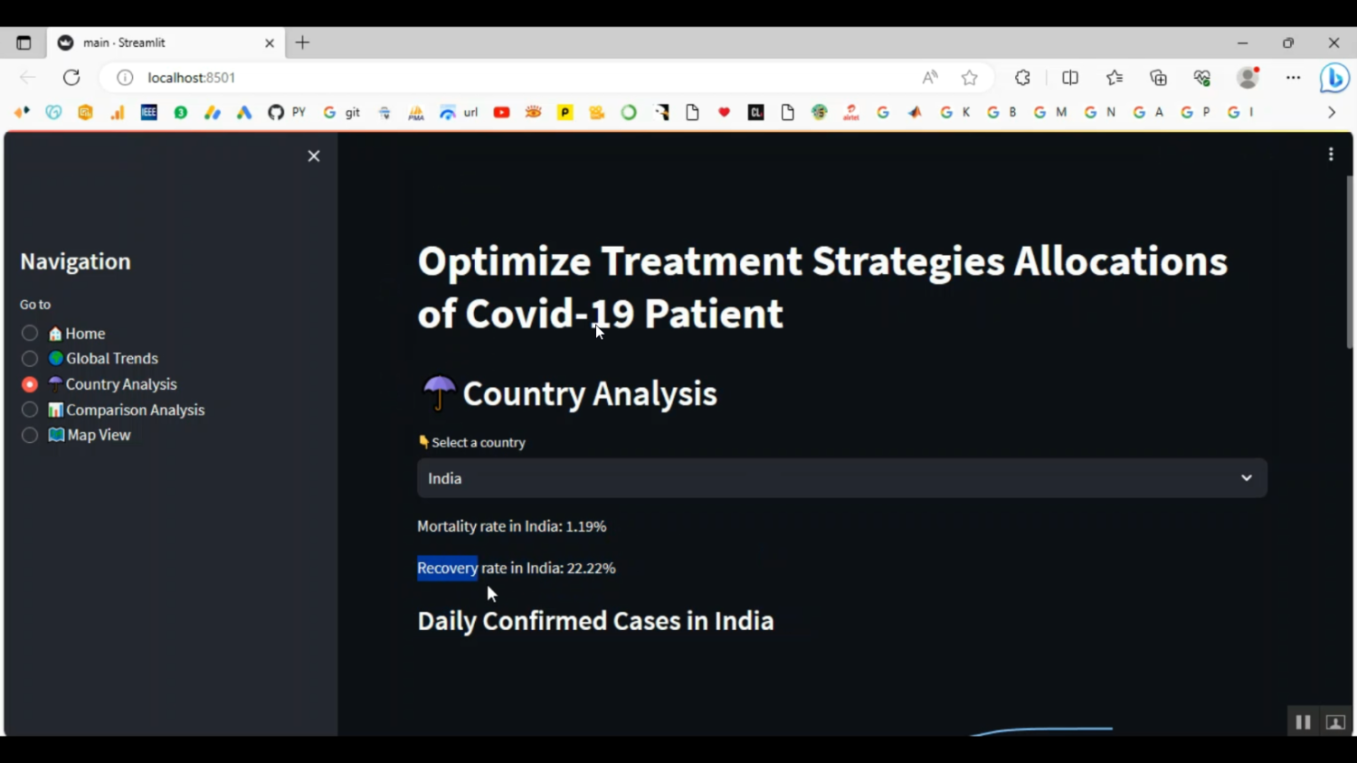 The proposed system introduces a Python and Streamlit–based framework for COVID time value prediction. The workflow includes data collection and preprocessing (handling missing values, normalization, and feature selection), training of machine learning models such as Linear Regression, Random Forest, or Gradient Boosting, and interactive visualization using Streamlit. Users can input relevant variables, adjust parameters, and receive predictions for COVID-related temporal metrics in real time. Compared to existing systems, this approach provides automation, interactive visualization, real-time prediction, and ease of use, making it practical for healthcare authorities, researchers, and decision-makers to anticipate trends and take timely actions.