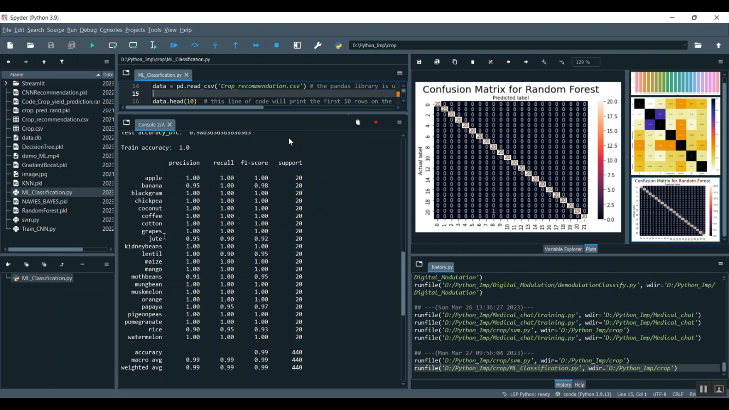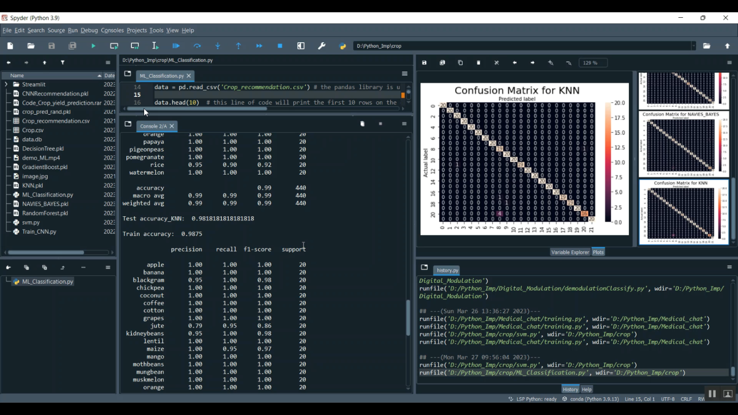 Accurate crop yield prediction is a vital aspect of modern agriculture, enabling farmers, policymakers, and agronomists to make informed decisions on resource allocation, crop selection, and market planning. This project, Crop Yield Prediction Using ML Classification in Python, applies machine learning algorithms to classify expected crop yields (e.g., high, medium, or low) based on soil parameters, climatic conditions, and crop features. The dataset includes attributes such as rainfall, temperature, humidity, soil fertility, and past crop performance. Using Python libraries such as Pandas, NumPy, Scikit-learn, and Matplotlib, the data is preprocessed, classified using ML models (e.g., Decision Tree, Random Forest, KNN, and SVM), and evaluated through accuracy, precision, recall, and F1-score. The system supports sustainable agriculture and minimizes farmer risks by providing data-driven yield predictions.