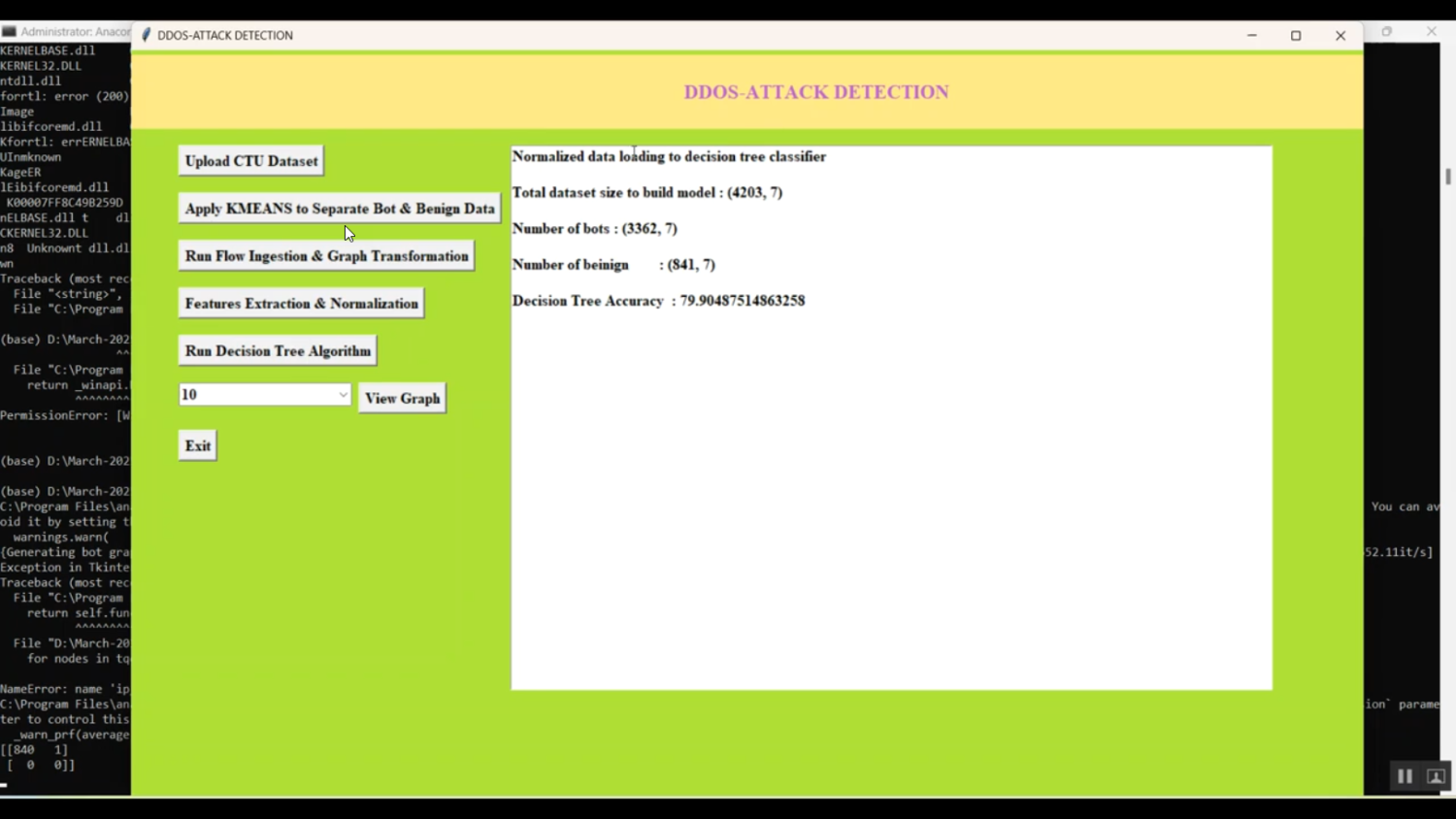 The proposed system presents a Python-based, hybrid DDoS detection framework that integrates flow-based analytics, behavioral modeling, and machine/deep learning to improve accuracy and responsiveness. Network telemetry (NetFlow/IPFIX, packet captures) is ingested and aggregated into features such as packet rates, byte rates, unique source counts, entropy measures, protocol distributions, and temporal statistics. Feature selection and dimensionality reduction (PCA, feature importance) prepare inputs for classifiers; supervised models detect known attack patterns while unsupervised/anomaly detectors (Isolation Forest, Autoencoders) surface novel or stealthy attacks. For temporal and application-layer detection, sequence models like LSTM or CNN-LSTM analyze time-windowed feature sequences to spot subtle behavioral changes. The system includes online learning or periodic retraining to adapt to evolving traffic patterns, a scoring and confidence mechanism to prioritize alerts, and explainability outputs (feature contributions, SHAP values) to assist operators. Integration with mitigation modules—traffic shaping, dynamic ACL updates, or cloud-provider scrubbing APIs—enables automated or operator-approved responses. Dashboards visualize traffic trends and incidents for rapid forensic analysis. Overall, this hybrid approach increases detection robustness, reduces false alarms, and enables scalable, real-time DDoS defense suitable for enterprise and cloud deployments.