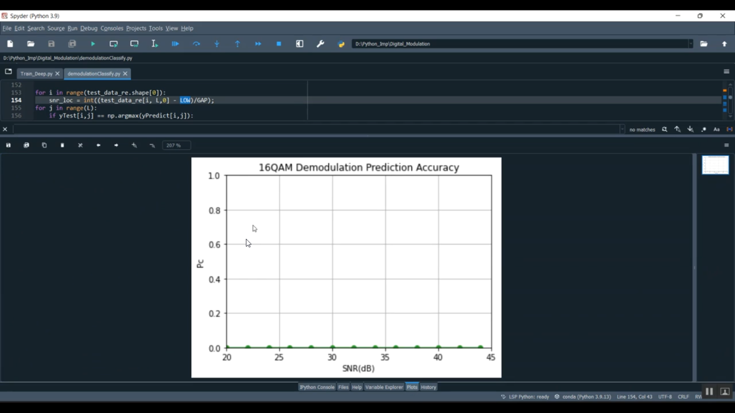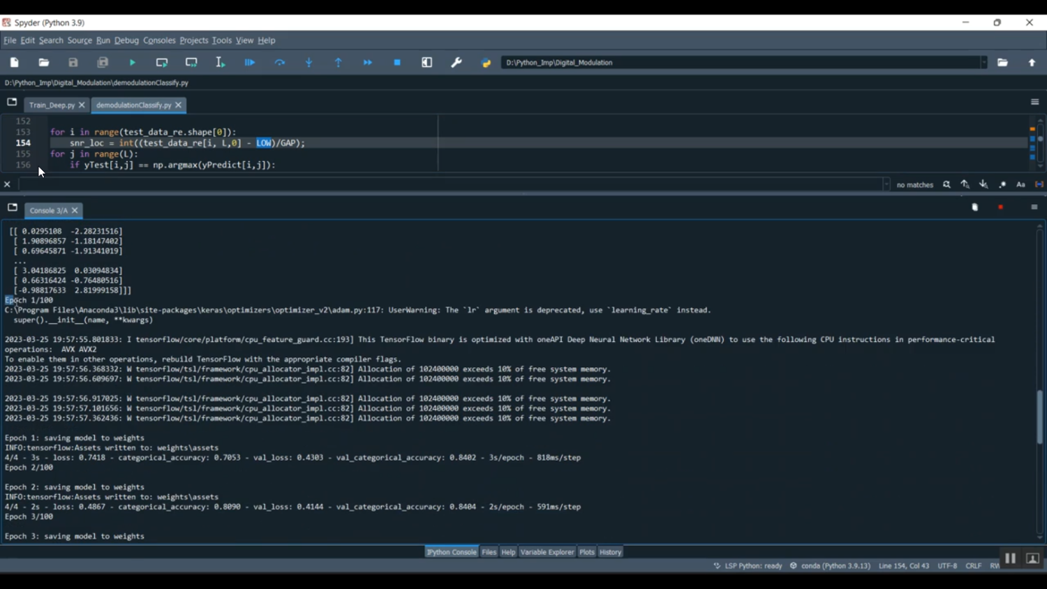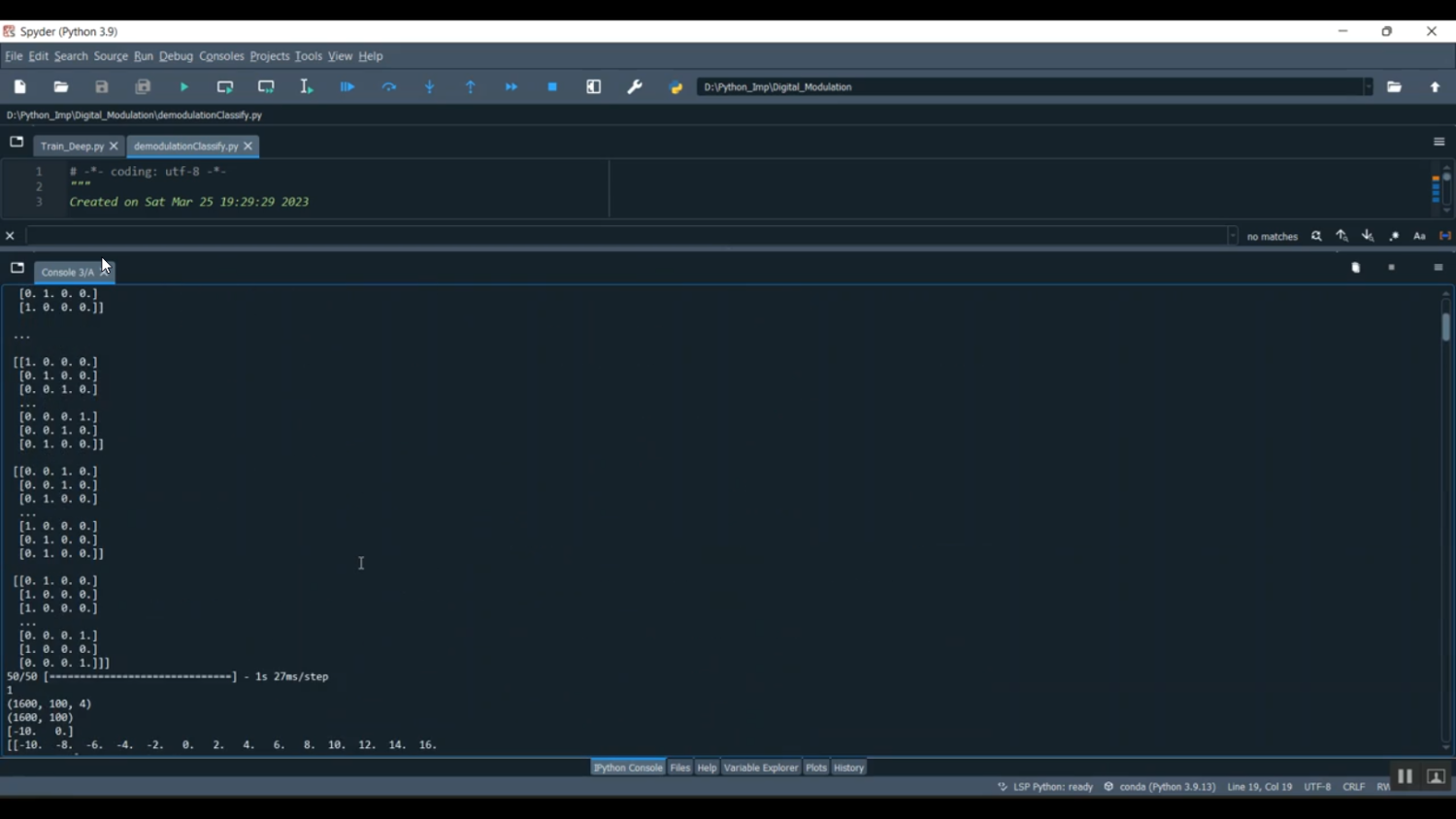 Digital modulation techniques are the backbone of modern communication systems, enabling efficient transmission of data over various channels. The project “Digital Modulation Train Data in Python” focuses on developing a simulation and classification system for digital modulation schemes such as Amplitude Shift Keying (ASK), Frequency Shift Keying (FSK), Phase Shift Keying (PSK), and Quadrature Amplitude Modulation (QAM). Using Python libraries like NumPy, Scikit-learn, TensorFlow/Keras, and Matplotlib, datasets of modulated signals are generated, preprocessed, and used to train machine learning and deep learning models for modulation classification. The system provides a practical platform to understand modulation patterns, noise effects, and recognition of modulation schemes, which is highly relevant for research in wireless communication and software-defined radios (SDR).