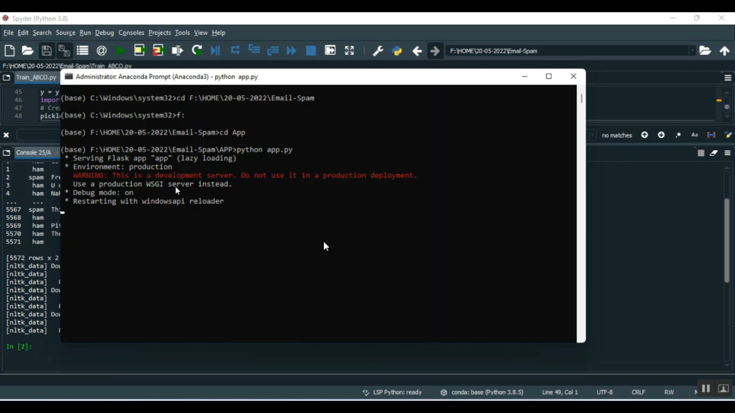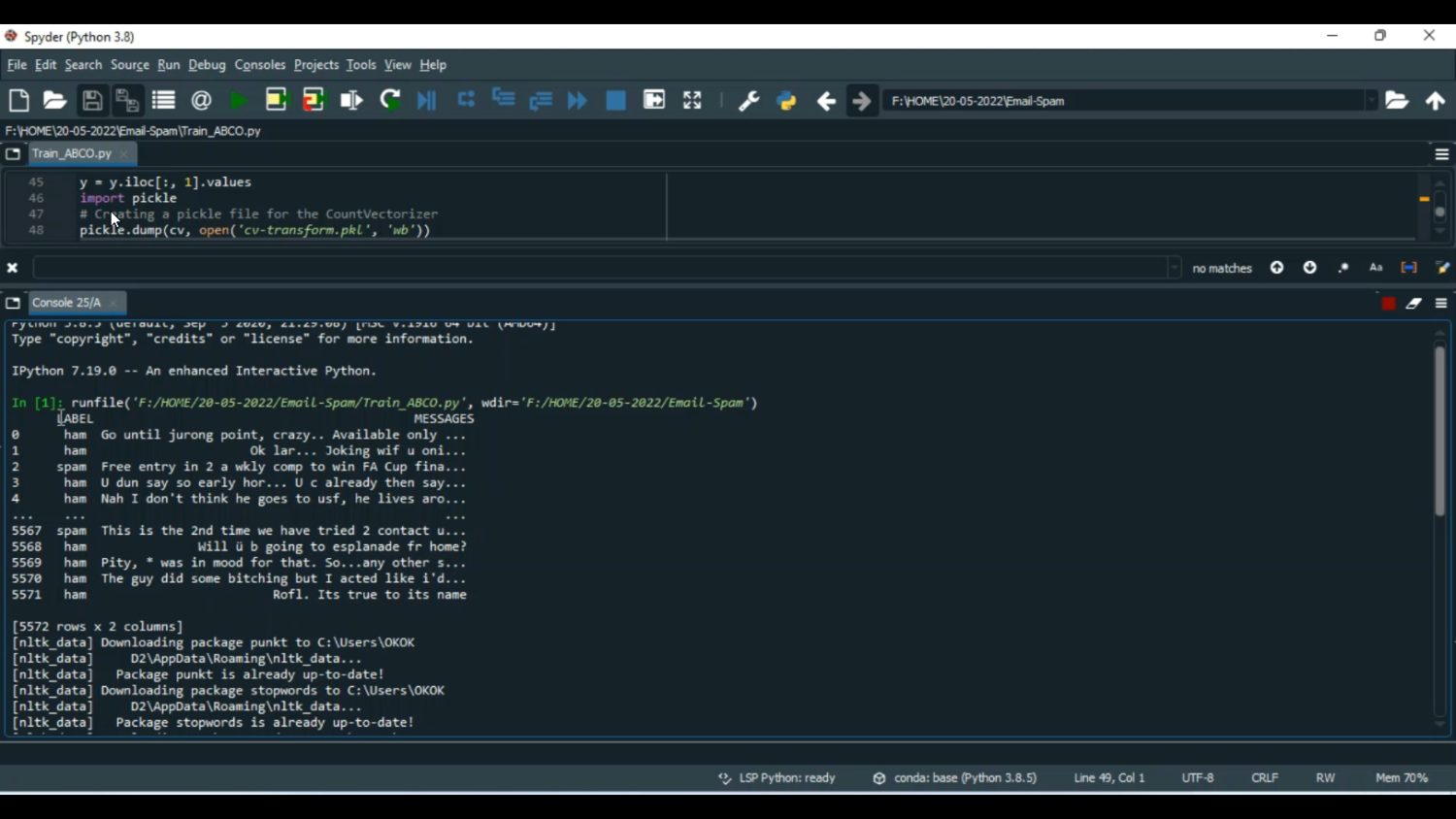 The proposed system utilizes Python-based machine learning models to automatically classify emails into spam and ham categories. It processes email content through preprocessing techniques such as tokenization, stopword removal, stemming, and TF-IDF vectorization to convert raw text into meaningful features. Algorithms such as Naïve Bayes, Support Vector Machines (SVM), Random Forest, and even deep learning models like LSTM can be applied to detect spam with higher accuracy. The system is trained on large, labeled datasets and continuously improves through retraining, ensuring adaptability against new spam patterns. Implemented in Python with libraries like Scikit-learn, NLTK, and TensorFlow, the system achieves robust performance, scalability, and ease of deployment. By reducing false positives and enhancing detection accuracy, the model provides a reliable and efficient solution for modern spam filtering challenges.