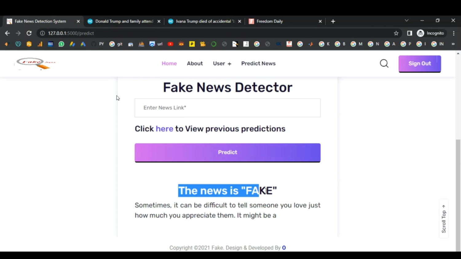 The proposed system introduces a Python-based Fake Media Detection framework that integrates machine learning classification across multiple media types. Input media undergoes preprocessing—image resizing and filtering for visuals, spectrogram generation for audio, and frame extraction for videos. Feature extraction methods identify anomalies such as unnatural facial movements, inconsistent textures, mismatched lighting, irregular pitch or waveform patterns, and metadata manipulation. These features are used to train ML classifiers such as Support Vector Machines (SVM), Random Forests, or deep learning models like CNNs and LSTMs for temporal video/audio analysis. The classifier outputs a probability score indicating whether the content is genuine or manipulated. The system can be extended with ensemble learning for higher accuracy and deployed with a user-friendly interface using Streamlit or Flask. By combining multi-modal analysis with scalable ML models, this project offers a powerful solution to combat misinformation, safeguard authenticity, and strengthen digital media trust.