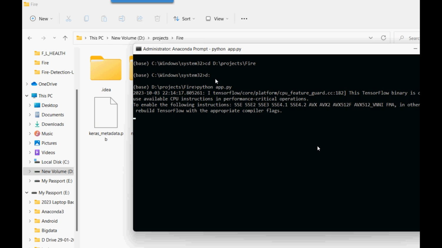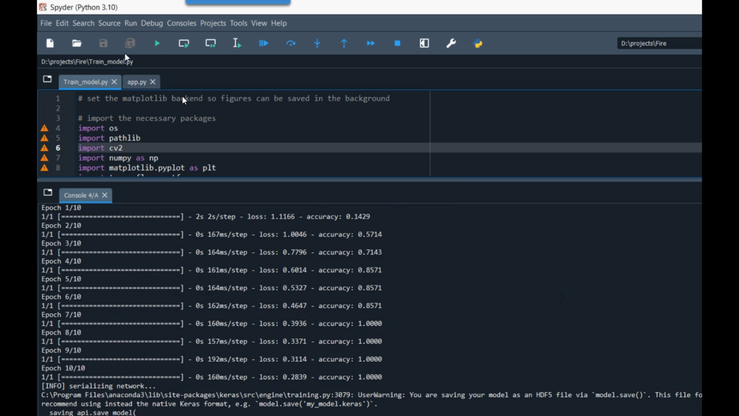 Early detection of fire is crucial for preventing damage to property, human life, and the environment. This project focuses on developing a Python-based Fire Detection system that uses a webcam to monitor real-time video feeds and analyze images for the presence of fire. By applying image processing techniques and machine learning algorithms, the system can identify fire regions based on color, motion, and texture features. Implemented using Python libraries such as OpenCV, NumPy, Scikit-learn, and TensorFlow/Keras, the system provides an automated, real-time fire detection solution with alerts for rapid response and disaster prevention.