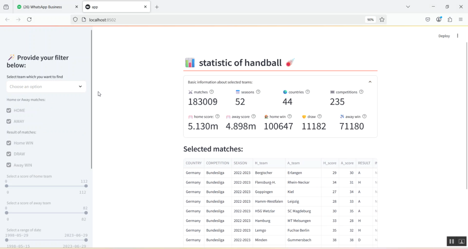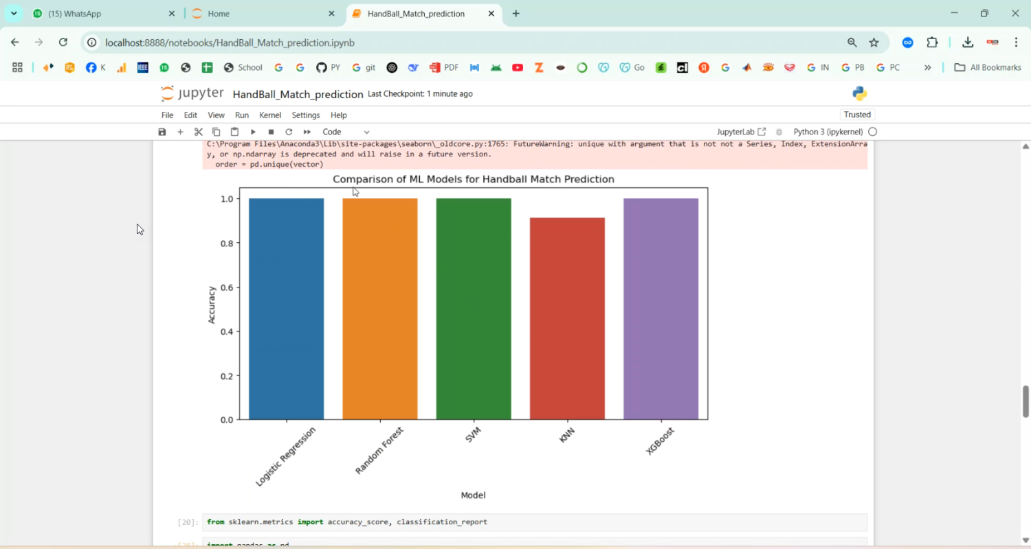Predicting outcomes of sports matches has become an important area in sports analytics, enabling coaches, analysts, and bettors to make informed decisions. The project Handball Match Prediction in Python Projects aims to develop an intelligent system that forecasts the result of handball matches based on historical team performance, player statistics, and match conditions. Python is used as the development platform due to its comprehensive libraries for data processing, machine learning, and visualization, including Pandas, NumPy, Scikit-learn, TensorFlow, Keras, and Matplotlib. The system collects historical match data, player metrics, team statistics, and environmental factors, and applies machine learning algorithms to classify or predict match outcomes. By providing accurate predictions, the system helps teams strategize, assists analysts in performance evaluation, and supports stakeholders in making informed decisions.