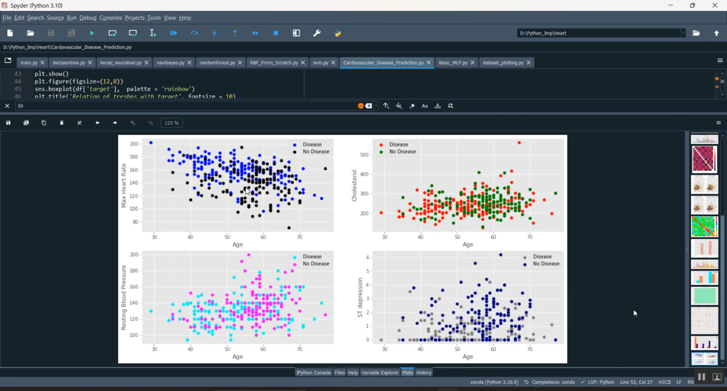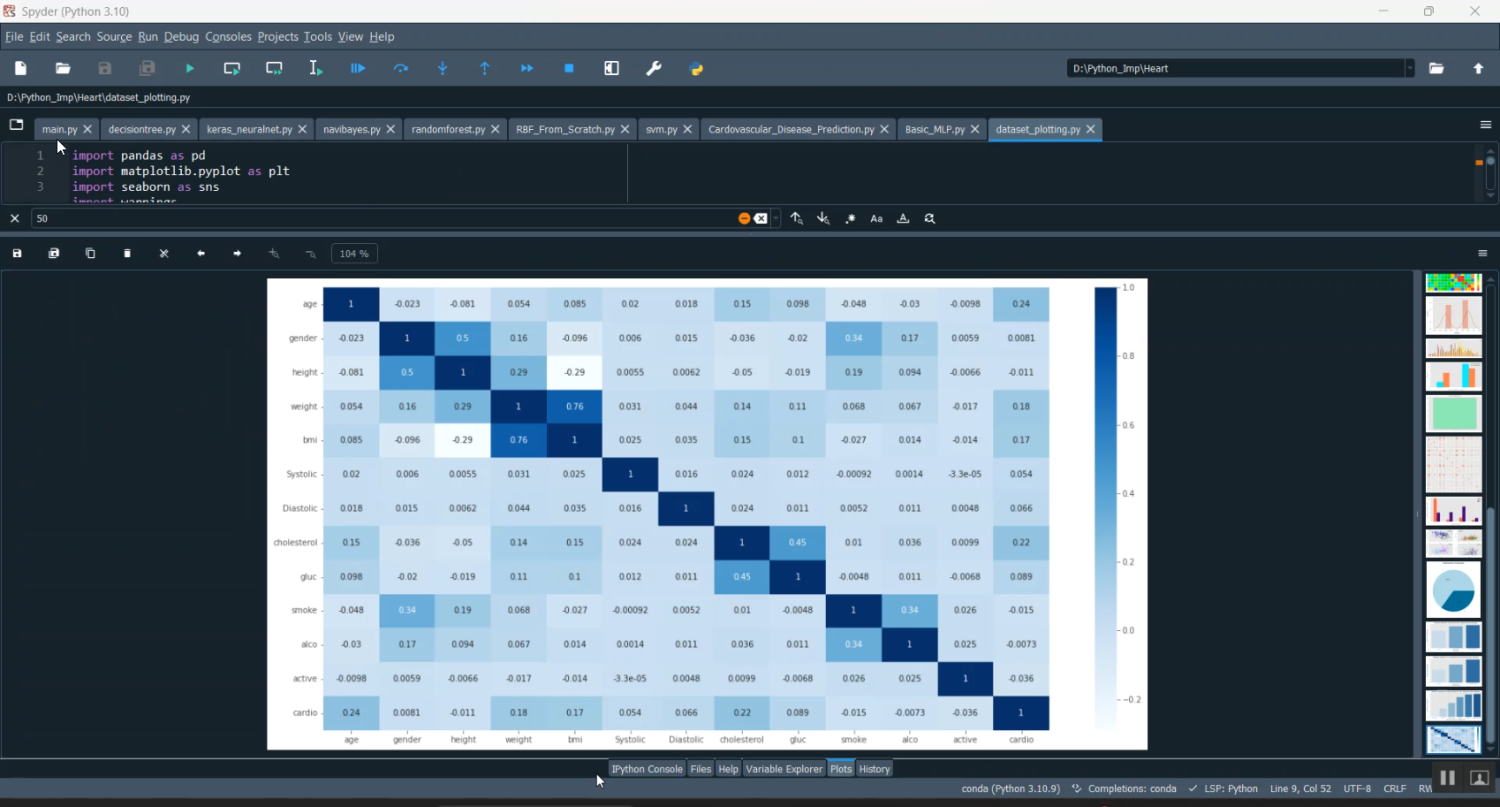 The proposed system introduces a Python-based ML framework for heart disease classification. Patient datasets are preprocessed by handling missing values, normalizing numerical features, and encoding categorical variables to improve model performance. Multiple supervised learning algorithms, including Logistic Regression, Decision Tree, Random Forest, Support Vector Machine (SVM), and Gradient Boosting, are trained and compared to identify the best-performing model. Performance evaluation is carried out using metrics such as accuracy, precision, recall, F1-score, and confusion matrices to ensure robustness and reliability. Python libraries such as Pandas and NumPy handle data preprocessing, Scikit-learn supports model training and evaluation, and Matplotlib or Seaborn is used for visualizing data trends and model performance. By integrating multiple ML algorithms with comprehensive data preprocessing and evaluation, the system provides an efficient, scalable, and accurate solution for heart disease prediction, aiding early diagnosis and preventive healthcare management.