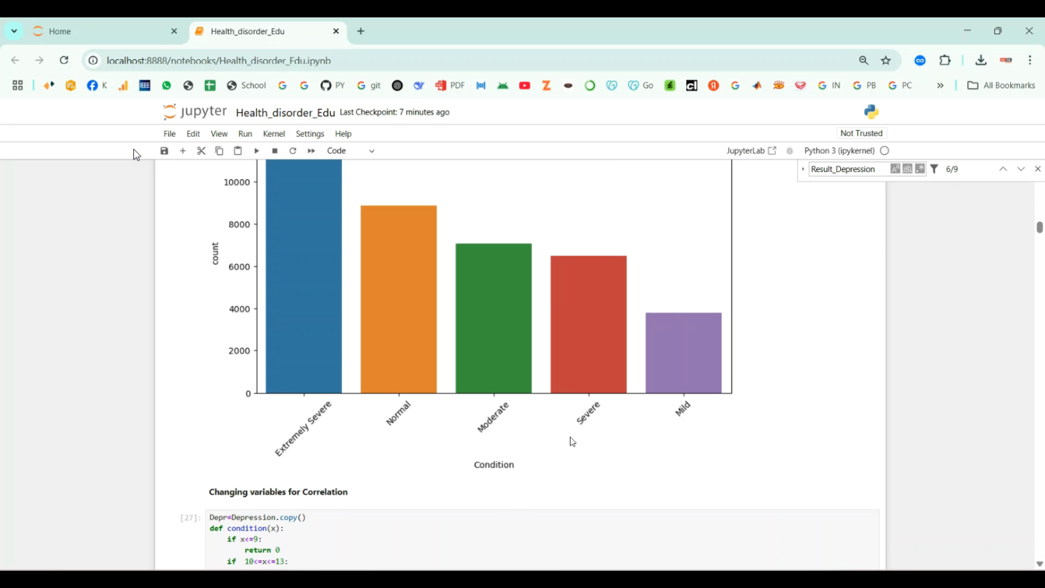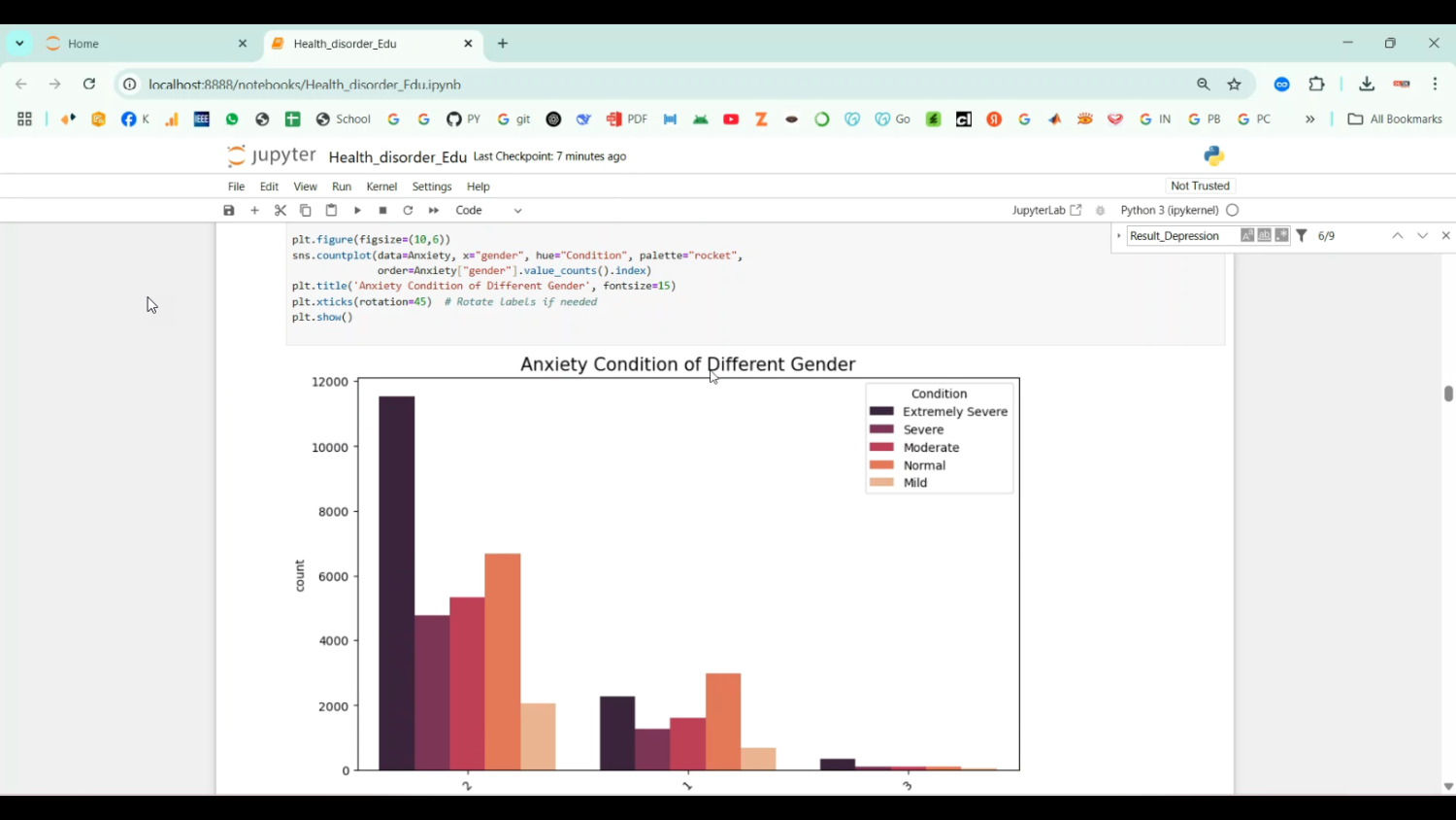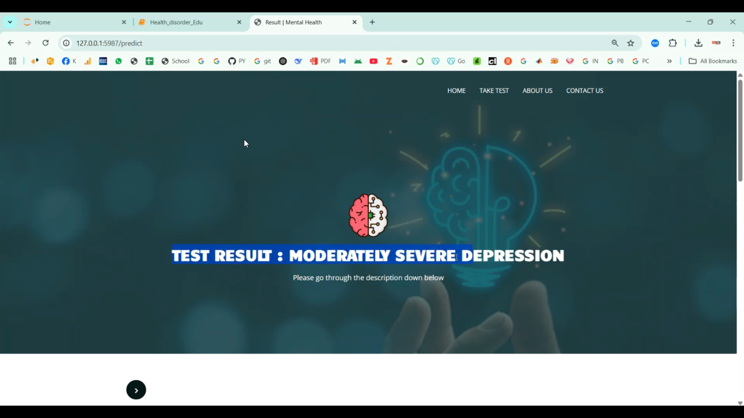 Depression is a common mental disorder that can severely impact daily functioning and quality of life, with moderately severe depression requiring timely identification and intervention. The project Moderately Severe Depression Detection in Python Projects focuses on developing an intelligent system that predicts the presence and severity of depression using machine learning and data analytics. Python is chosen as the development platform due to its rich libraries for data preprocessing, natural language processing (NLP), and machine learning, including Pandas, NumPy, Scikit-learn, TensorFlow, Keras, and NLTK. The system collects data from surveys, questionnaires, social media, and behavioral patterns, analyzes responses and textual content, and predicts moderately severe depression levels. By providing automated assessment, the system enables early intervention, personalized treatment, and continuous monitoring of mental health.