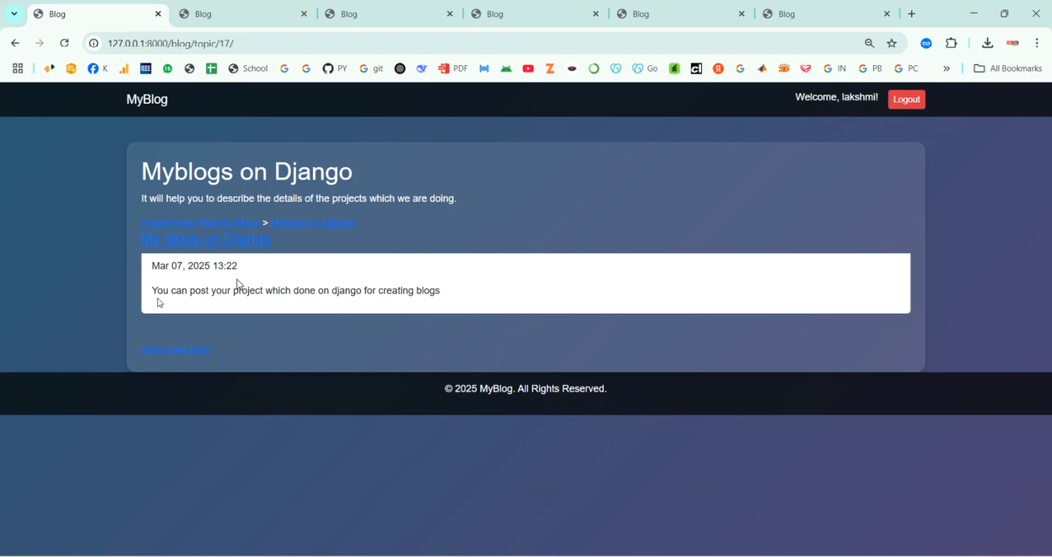 Blogging platforms provide a convenient way for individuals and organizations to share content, ideas, and updates online. The project My Blogs on Django in Python Projects focuses on developing a fully functional blogging application using the Django framework in Python. Django is chosen as the development platform for its robust features, built-in security, scalability, and ease of use for rapid web development. The system allows users to create, edit, and publish blog posts, manage categories and tags, and interact with readers through comments. It also includes features such as user authentication, profile management, and an admin dashboard for monitoring content. This project provides a structured and secure platform for sharing content online, supporting both personal and professional blogging needs.