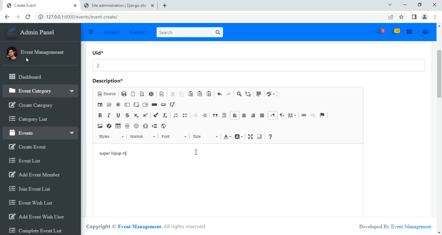 Managing events in an organization involves planning, scheduling, budgeting, and coordinating multiple stakeholders. This project focuses on developing an Organizational Event Management System in Django Python, designed to automate the process of creating, managing, and tracking organizational events. The system allows administrators to post events, register participants, assign roles, and manage resources, while employees or members can view upcoming events, register for participation, and receive notifications. Using Django with a PostgreSQL/MySQL database, the platform ensures secure authentication, streamlined workflows, and a user-friendly interface for efficient event handling.