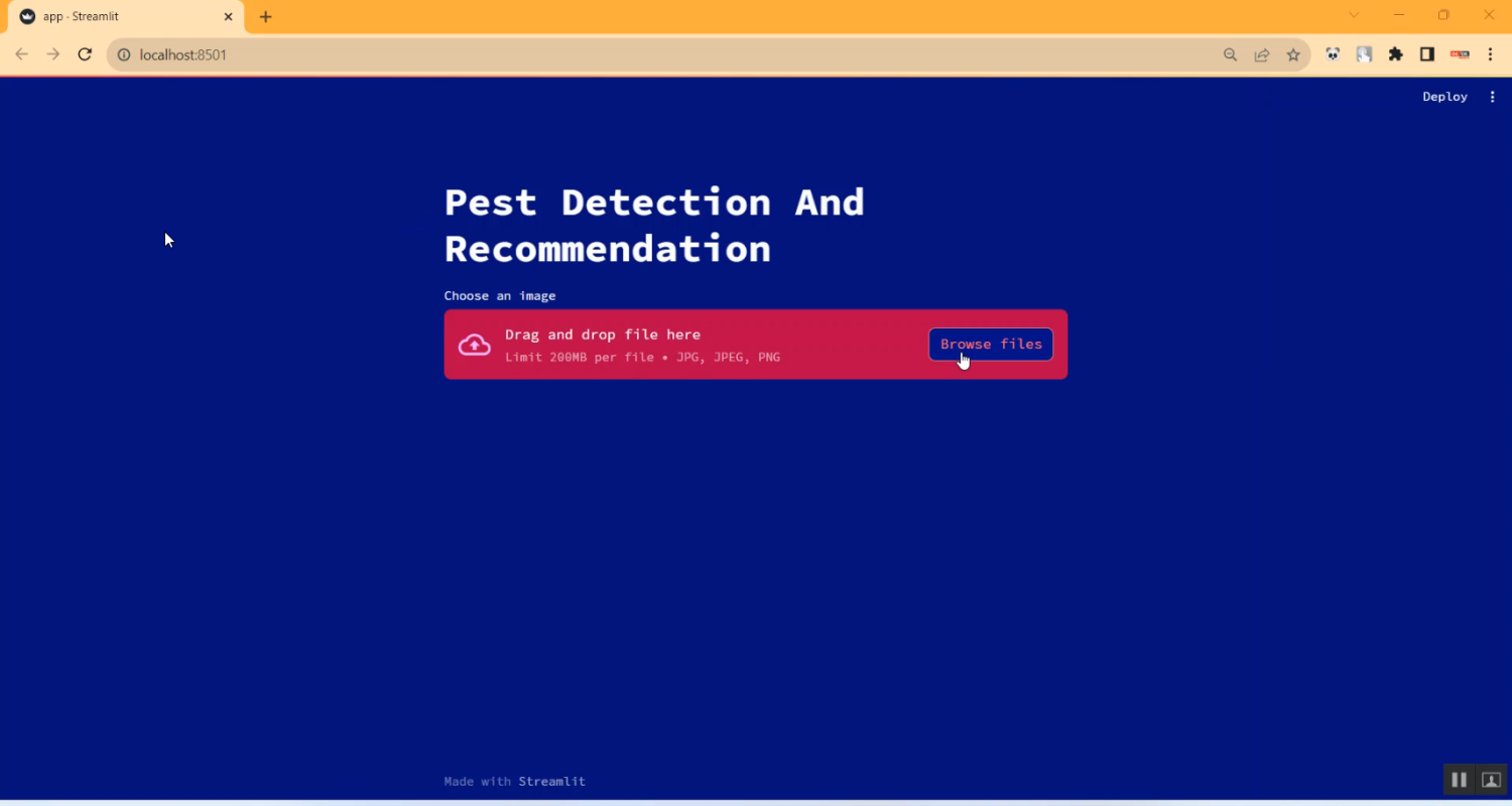 The Pests Detection Using CNN with Recommendation for Farmer Project is a Python-based intelligent system designed to detect and classify agricultural pests from plant images and provide actionable recommendations for farmers. The system leverages Convolutional Neural Networks (CNNs) to automatically analyze uploaded images, identify pest types, and assess infestation severity. Implemented using Python with libraries such as TensorFlow/Keras, OpenCV, NumPy, Pandas, and Streamlit, the project also integrates a recommendation module that suggests appropriate pest control measures, including chemical treatments, organic solutions, or preventive strategies. This combination of automatic detection and decision support helps farmers minimize crop damage, improve yield, and implement timely pest management practices efficiently.