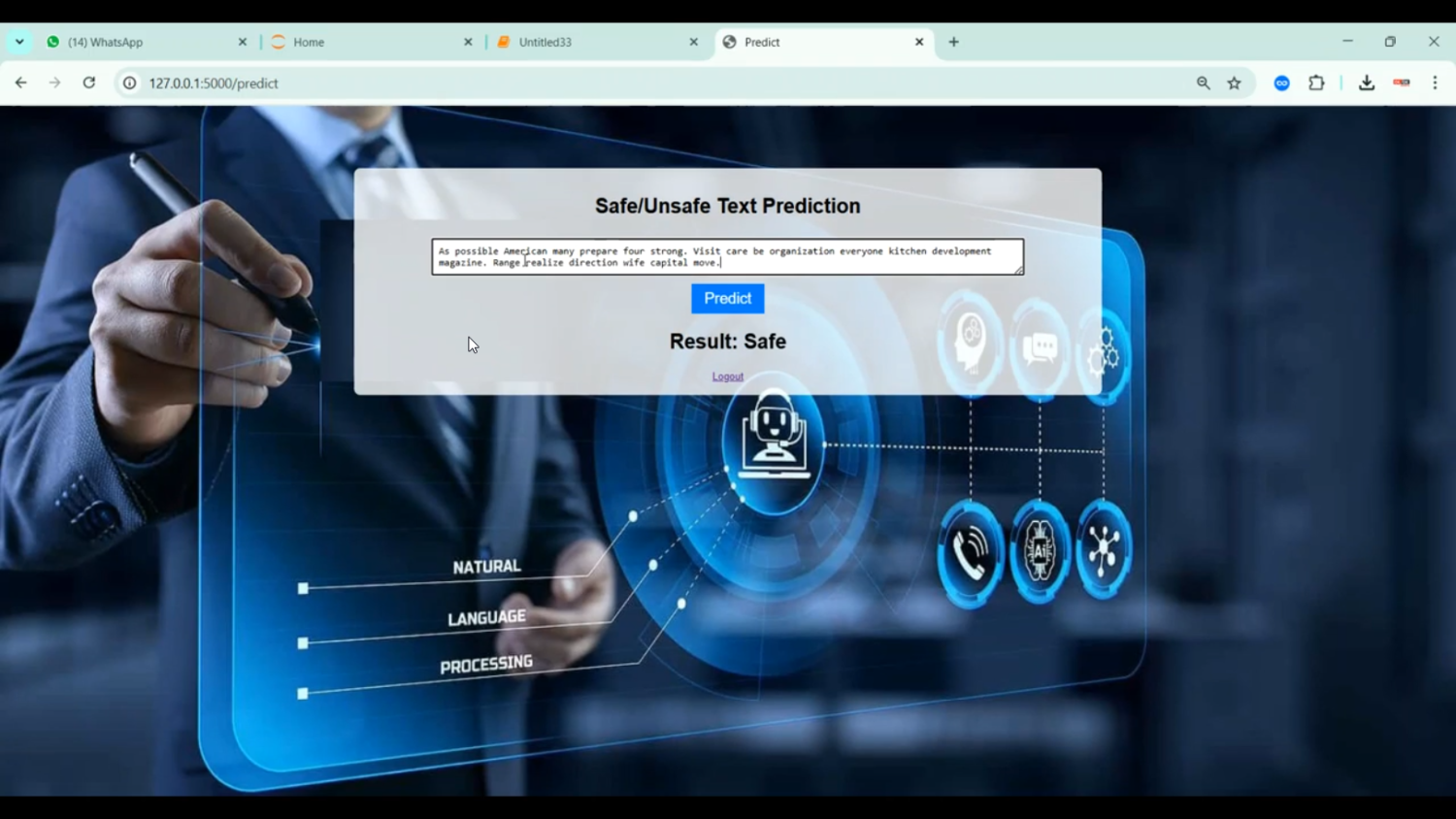 The proposed system introduces a Python-based framework for safe and unsafe text classification using NLP and machine learning. Text data is preprocessed through tokenization, lemmatization, stop-word removal, and vectorization techniques such as TF-IDF, Word2Vec, or transformer-based embeddings like BERT. Machine learning models such as Logistic Regression, Random Forest, Support Vector Machines (SVM), or deep learning models like LSTM and CNN are trained to classify text as safe or unsafe. The system’s performance is evaluated using metrics such as accuracy, precision, recall, F1-score, and confusion matrices. By combining advanced NLP techniques with machine learning classification, the system provides an automated, scalable, and accurate solution for moderating textual content, ensuring safer online communication and reducing exposure to harmful information.