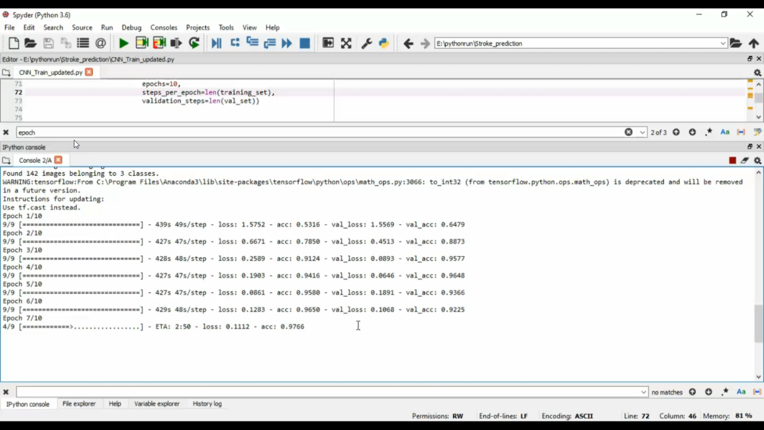 Stroke is a life-threatening medical condition that requires early detection and timely intervention to prevent severe complications or fatalities. This project focuses on stroke prediction using Convolutional Neural Networks (CNN) in Python, enabling automated analysis of patient data and medical imaging for early risk assessment. The system collects structured patient data such as age, blood pressure, cholesterol levels, and other medical indicators, along with imaging data when available. Data preprocessing and feature extraction are performed before training a CNN model to identify patterns and predict stroke risk. Python libraries such as Pandas, NumPy, TensorFlow/Keras, and Matplotlib are used for data handling, model training, and visualization. The project aims to provide an accurate and efficient tool for early stroke prediction, supporting healthcare professionals in preventive care and treatment planning.