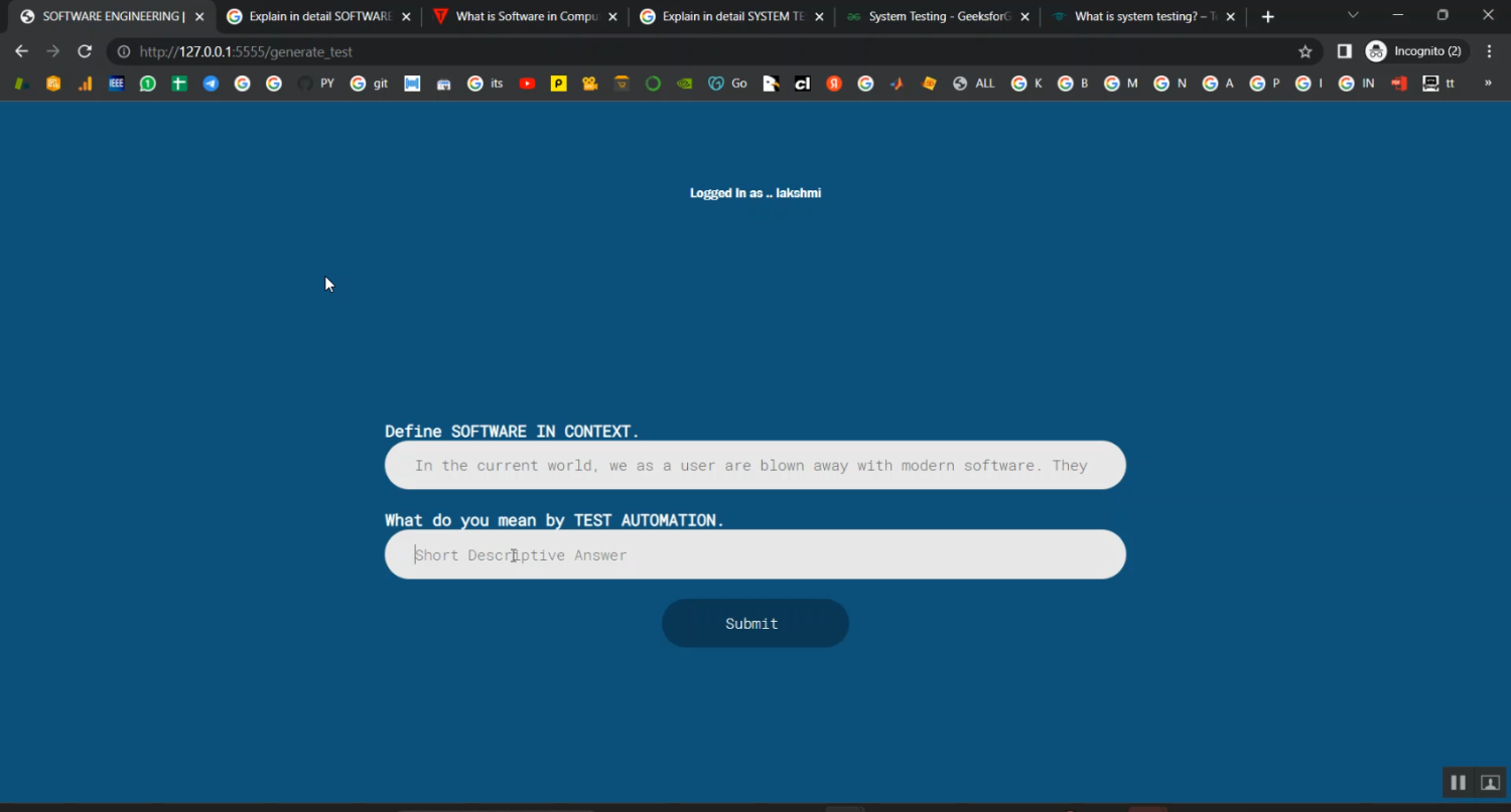 The proposed system introduces an NLP and ML-based automated subjective answer evaluation model that intelligently understands and scores student responses. The system preprocesses answers by removing stopwords, normalizing text, and extracting keywords. Semantic similarity is calculated using Cosine Similarity or Word Embedding models like Word2Vec or BERT to compare the student’s answer with the reference answer. Additional metrics such as grammar score, content relevance, keyword density, and coherence are also calculated to assign a final score. Machine learning regression or classification models are trained on manually graded datasets to improve scoring accuracy. The system uses Python with libraries like NLTK, Scikit-learn, Spacy, and Transformers for implementation. This automated system ensures consistent and unbiased evaluation, supports real-time assessment, and can be deployed in e-learning platforms to enhance learning analytics.
