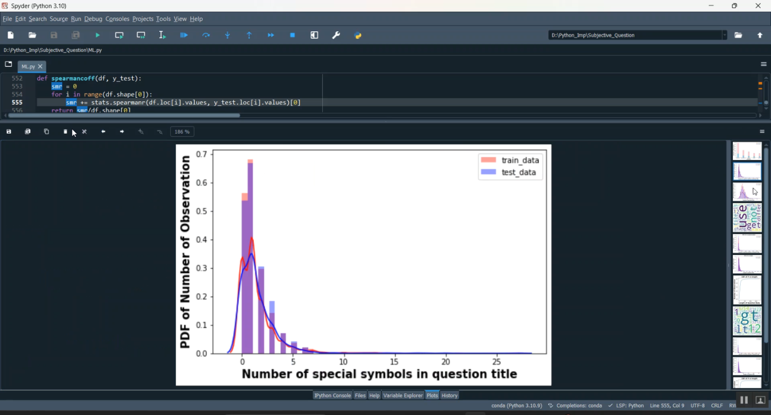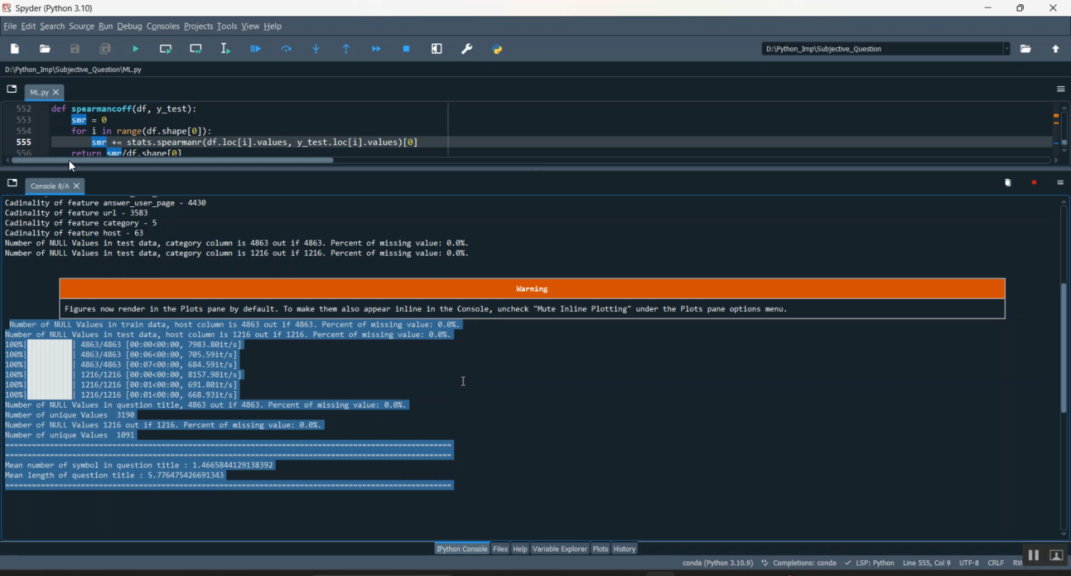 Subjective question evaluation is a challenging task in academic and professional examinations because answers vary in writing style, sentence structure, and expression. Manual evaluation is time-consuming, prone to human bias, and lacks scalability. This project focuses on Subjective Question Answer Analysis using Machine Learning in Python, which automatically evaluates and scores descriptive answers submitted by students. The system extracts semantic similarity between model answers and student responses using Natural Language Processing (NLP) techniques such as tokenization, stemming, lemmatization, and TF-IDF feature extraction. Machine learning models like Logistic Regression, Support Vector Machines, and BERT-based semantic similarity models are used to assess relevance, keyword coverage, grammar quality, and context correctness. The project aims to provide fair, consistent, and automated evaluation of subjective responses, reducing teacher workload and improving assessment transparency.
