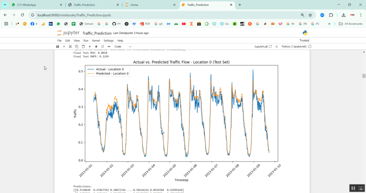 Efficient traffic management is essential for reducing congestion, minimizing travel time, and improving urban mobility. The project Traffic Flow Prediction in Python Projects focuses on developing an intelligent system that predicts traffic flow using historical traffic data, sensor information, and machine learning or deep learning techniques. Python is chosen as the development platform due to its powerful libraries for data analysis, visualization, and predictive modeling, including Pandas, NumPy, Scikit-learn, TensorFlow, and Keras. The system collects traffic data such as vehicle count, speed, and occupancy from sensors or datasets, preprocesses the data, and applies time-series models or deep learning architectures like LSTM, GRU, or CNN-LSTM to forecast traffic flow. By providing accurate predictions, the system assists traffic authorities, urban planners, and commuters in optimizing routes, reducing congestion, and improving transportation efficiency.