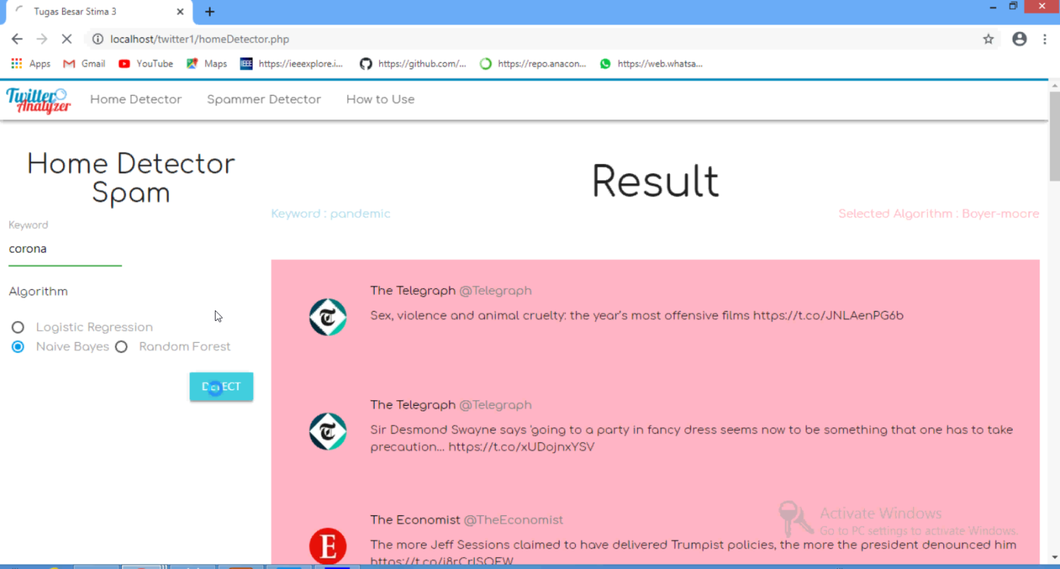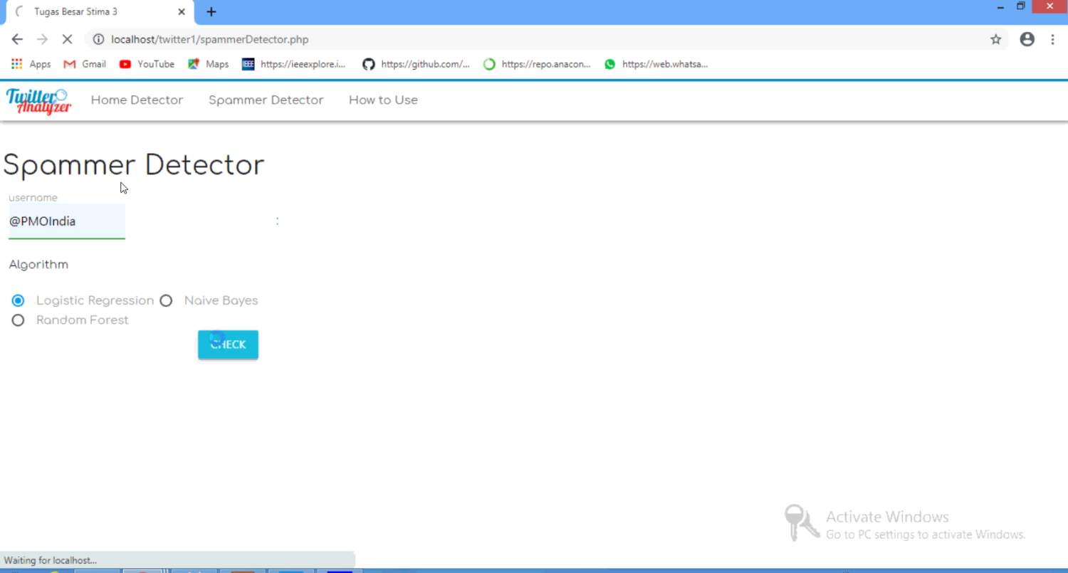 The proposed system introduces a Python-based Twitter spam detection engine with a PHP GUI for interactive user interaction. Tweets and user profiles are collected via the Twitter API, preprocessed to remove noise, and converted into numerical features using NLP techniques such as TF-IDF or word embeddings. Machine learning models such as Random Forest, Gradient Boosting, or SVM are trained on labeled datasets to classify users and tweets as spam or legitimate. The PHP GUI allows users to enter Twitter handles or tweet IDs and instantly view spam detection results, along with graphical insights into tweet frequency, engagement metrics, and account credibility. By combining automated machine learning detection with an intuitive GUI, the system provides a scalable, efficient, and user-friendly solution for monitoring and managing spam on Twitter.