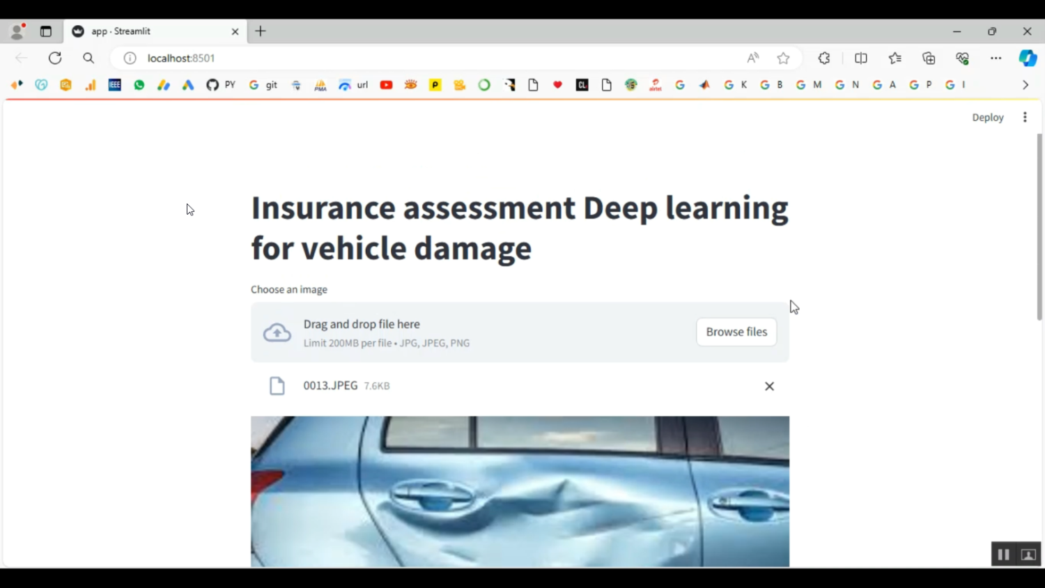 Vehicle damage assessment is a critical process for insurance companies to determine claim amounts and approve settlements efficiently. Manual inspection is often time-consuming, subjective, and prone to errors, leading to delays in claim processing. This project develops a Python-based system using Deep Learning (DL) techniques to automate vehicle damage assessment for insurance purposes. The system analyzes vehicle images, detects damaged areas, and evaluates the severity of damage using Convolutional Neural Networks (CNN). By providing rapid and accurate assessments, the system helps insurance companies streamline claim processing, reduce human errors, and ensure fair compensation for vehicle owners.