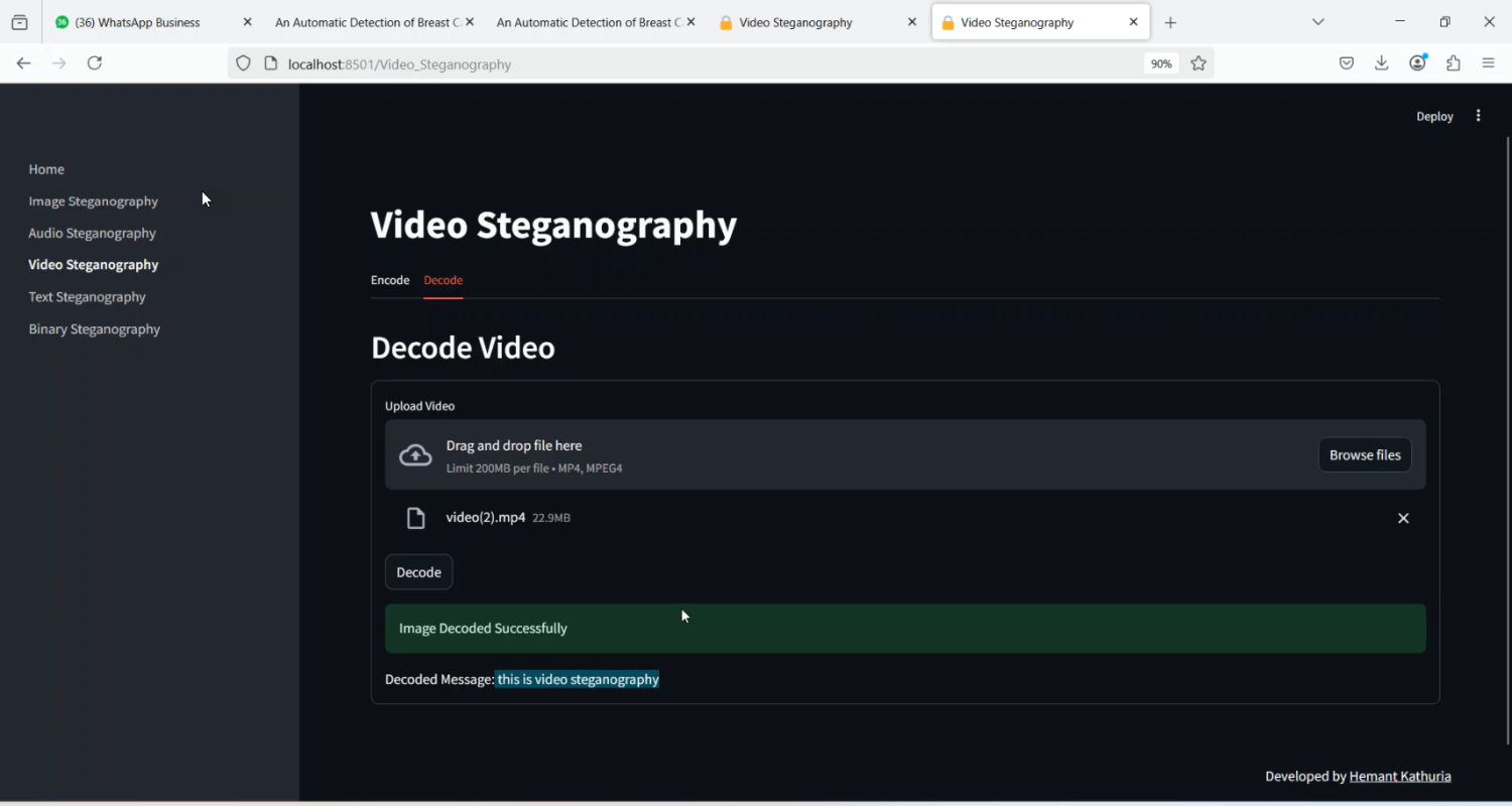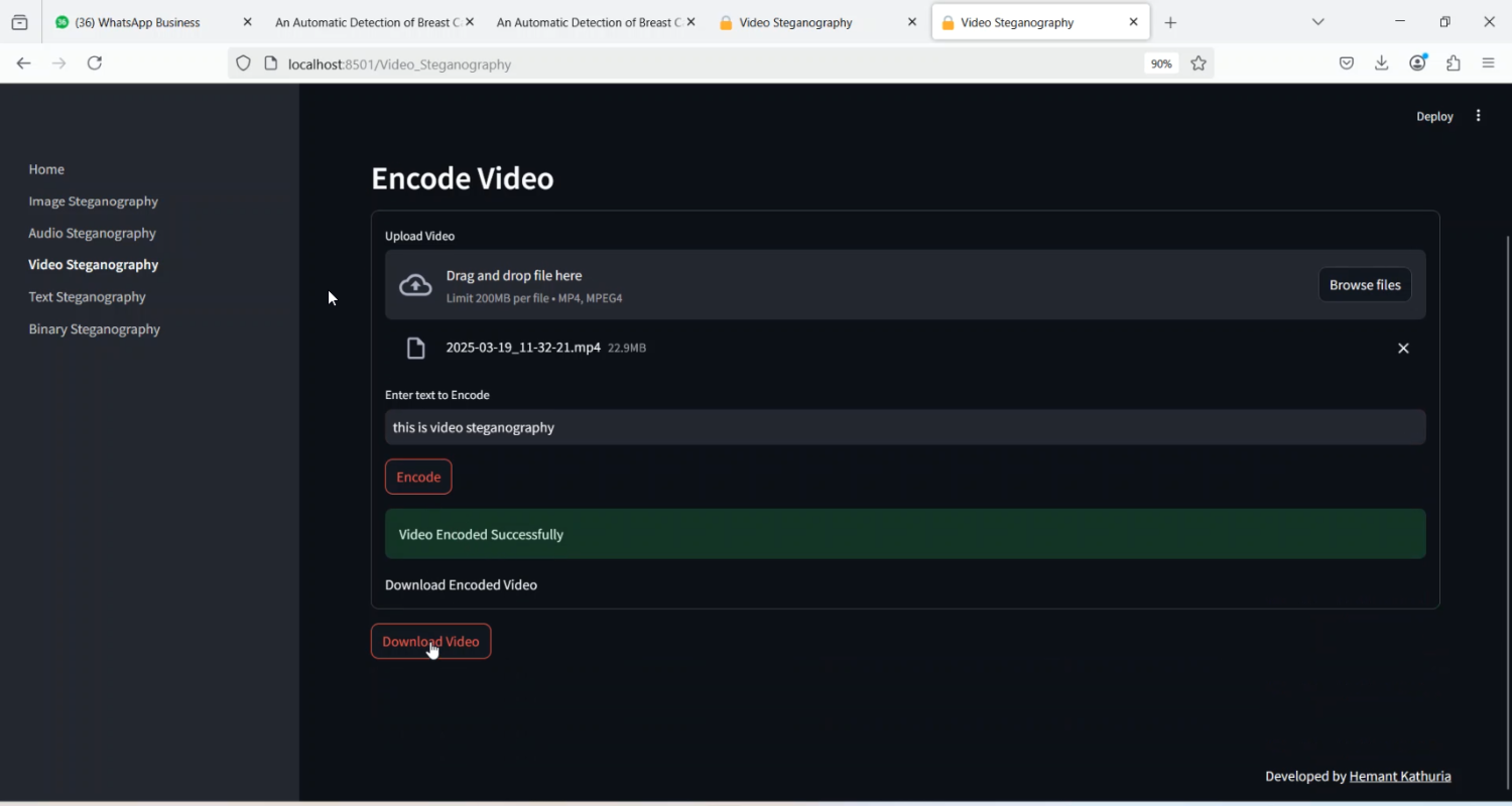 Video steganography is the process of concealing confidential information within video files to ensure secure communication and protect data from unauthorized access. The project Video Steganography in Python Projects focuses on developing a system that hides text, images, or other data within video frames using Python-based techniques, making the data imperceptible to unauthorized users. Python is chosen for its extensive libraries for video processing, image manipulation, and encryption, including OpenCV, NumPy, and PyCryptodome. The system embeds secret data into selected frames of a video while maintaining video quality and visual fidelity, and later extracts the hidden information securely. This method ensures confidential communication and enhances data security for digital media applications.